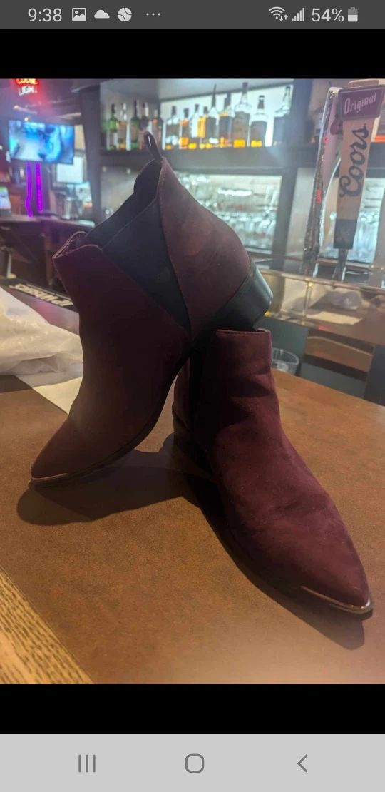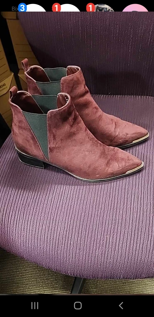 These are a pair of burgundy suede ankle boots with a pointed toe and a low heel. They have a black elastic panel on the inside of the ankle.a nice gold pinstripe along the front tips hardly ever worn like brand new