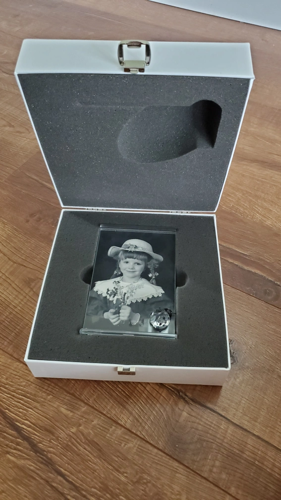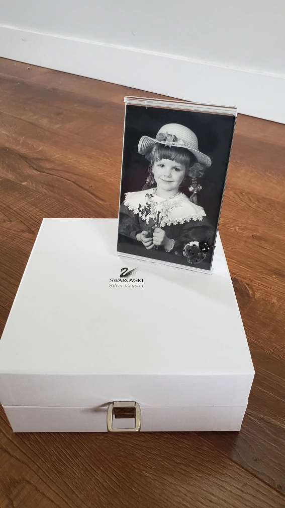 This is a Swarovski Crystal Ladybug photo frame. It comes in a white box with a clasp. It has a crystal ladybug attached to the bottom of the frame.