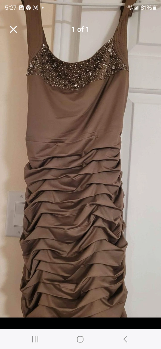 This is a brown dress with a beaded neckline. It is a sleeveless dress with a fitted bodice and a gathered skirt. It is knee length.