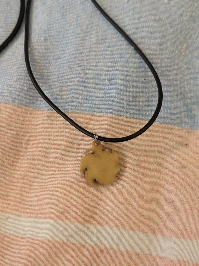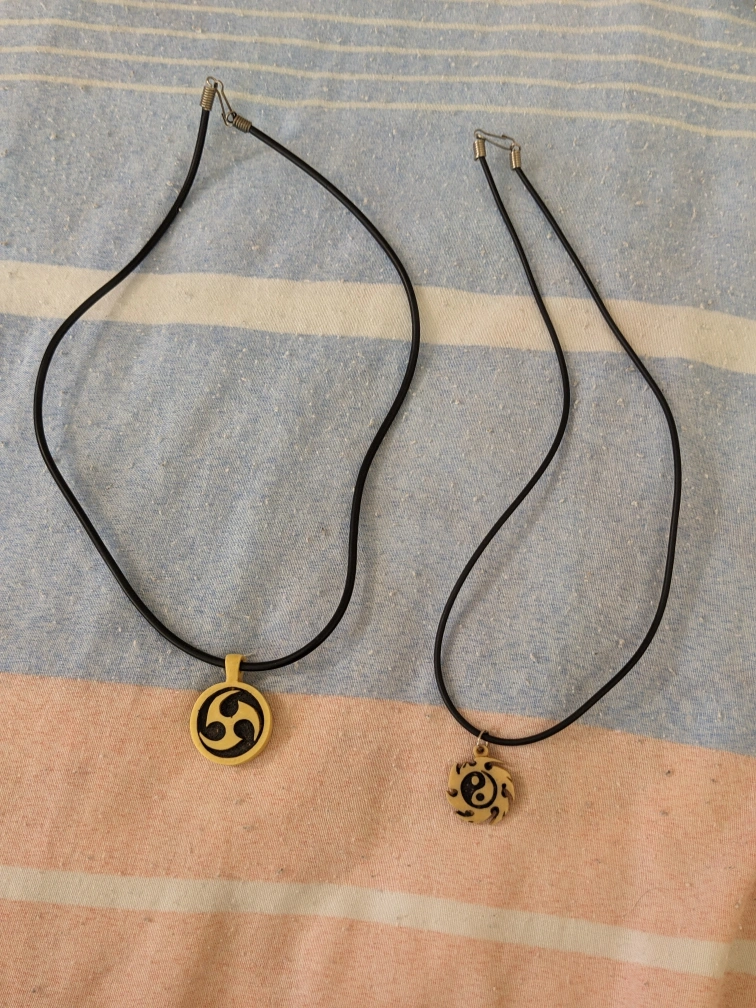 Two necklaces with pendants and black cords. One has a yin-yang symbol inside a swirl, and the other has a three-pointed star symbol.