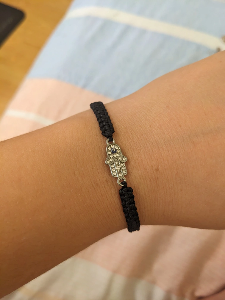 Black string bracelet with a silver Hamsa Hand charm with an evil eye in the centre, and small rhinestones around it. - BUY ONE $5 ITEM AND GET ANOTHER $5 ITEM FOR FREE!