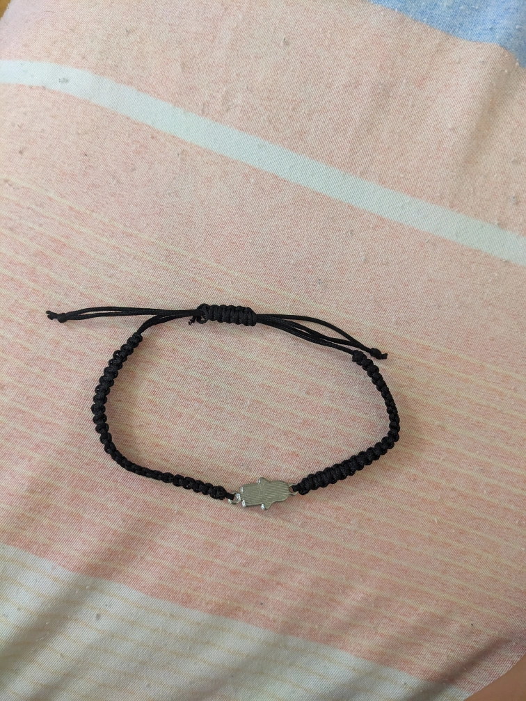 Black string bracelet with a silver Hamsa Hand charm with an evil eye in the centre, and small rhinestones around it.