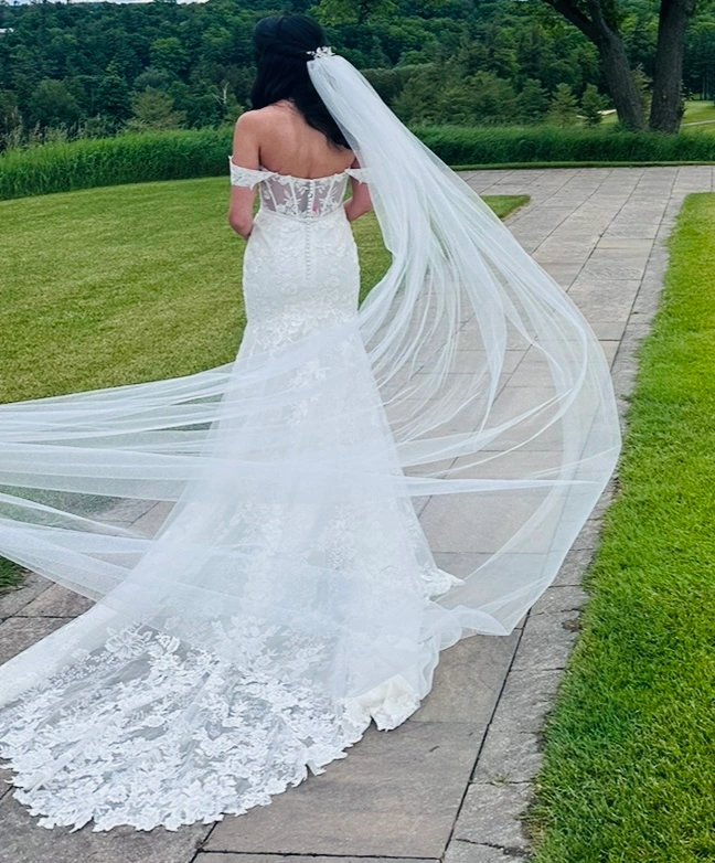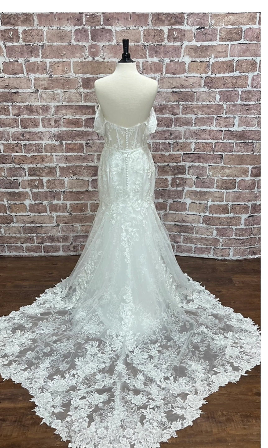 - A beautiful, classic, and elegant wedding dress with lace detailing for a soft romance or mega glam bride -In a great condition (worn once) -Color: Ivory -Plunging illusion strapless sweetheart neckline (strap is detachable) -Comes with a detachable belt -Sheer organza lined bodice with lace motifs over tulle -Covered button over zipper closure -Extended lace train -Bustle added to the dress