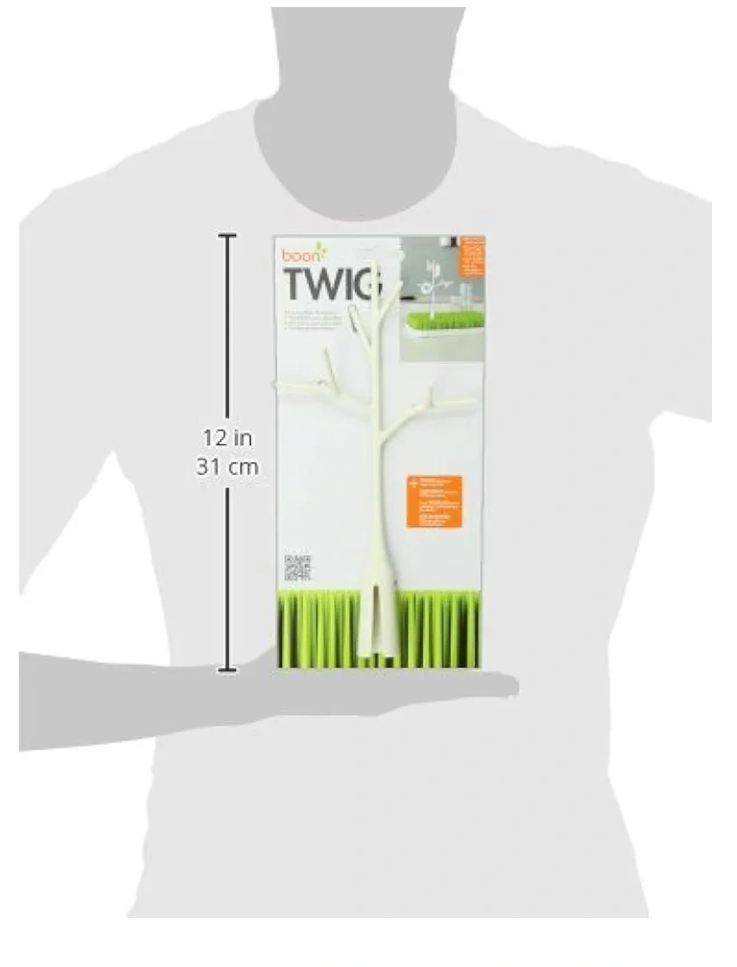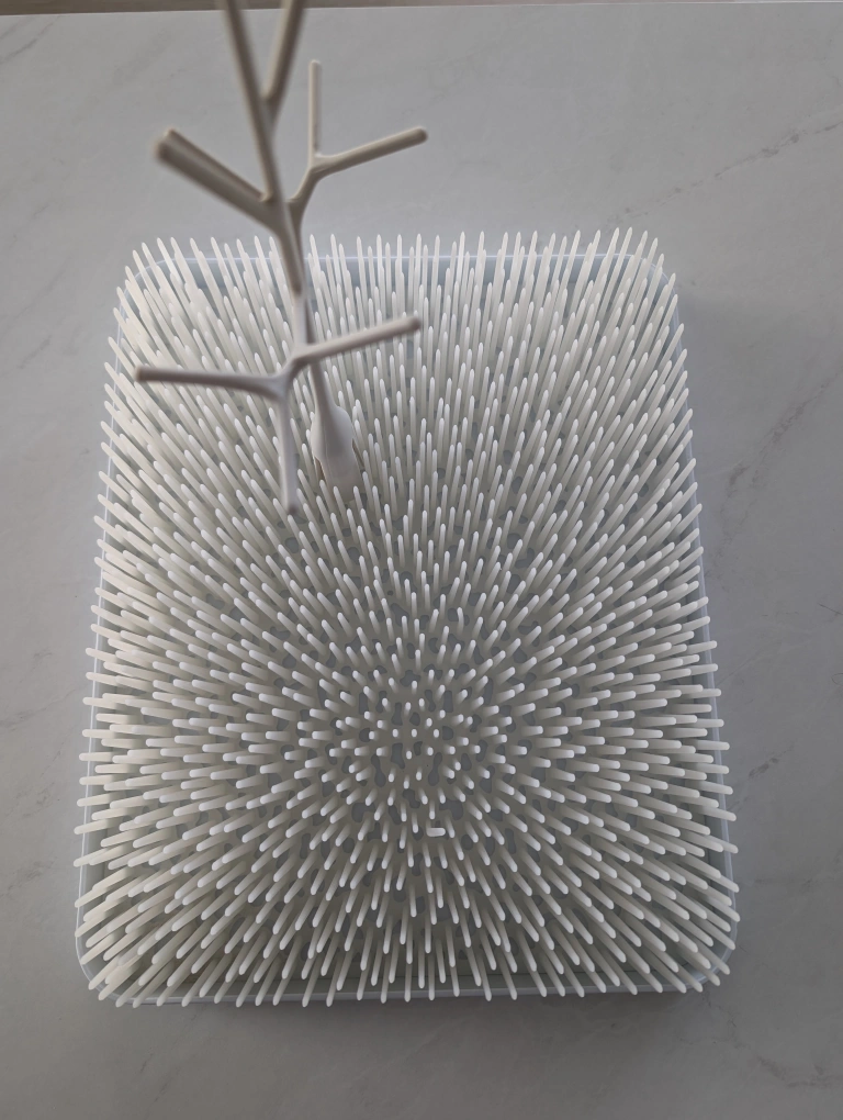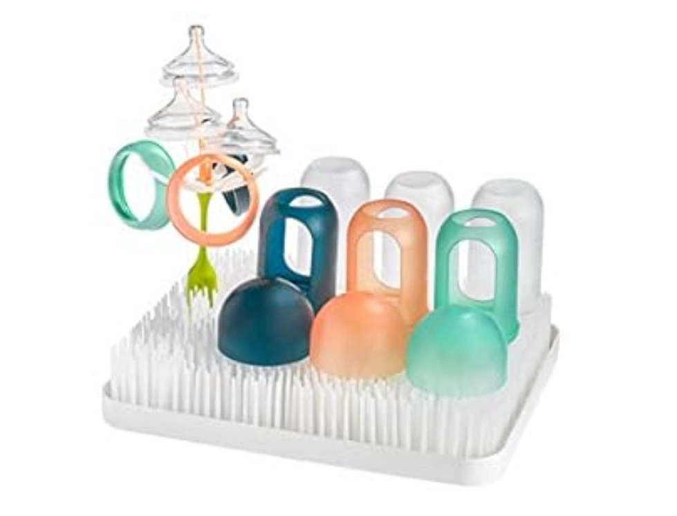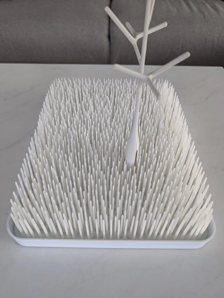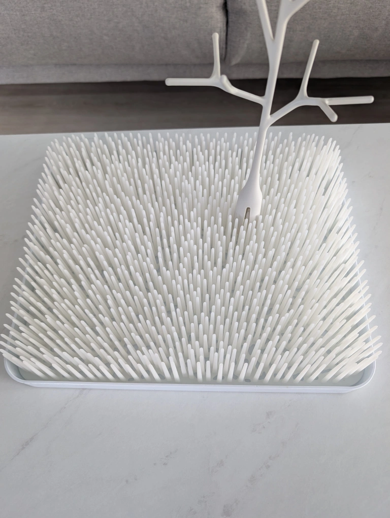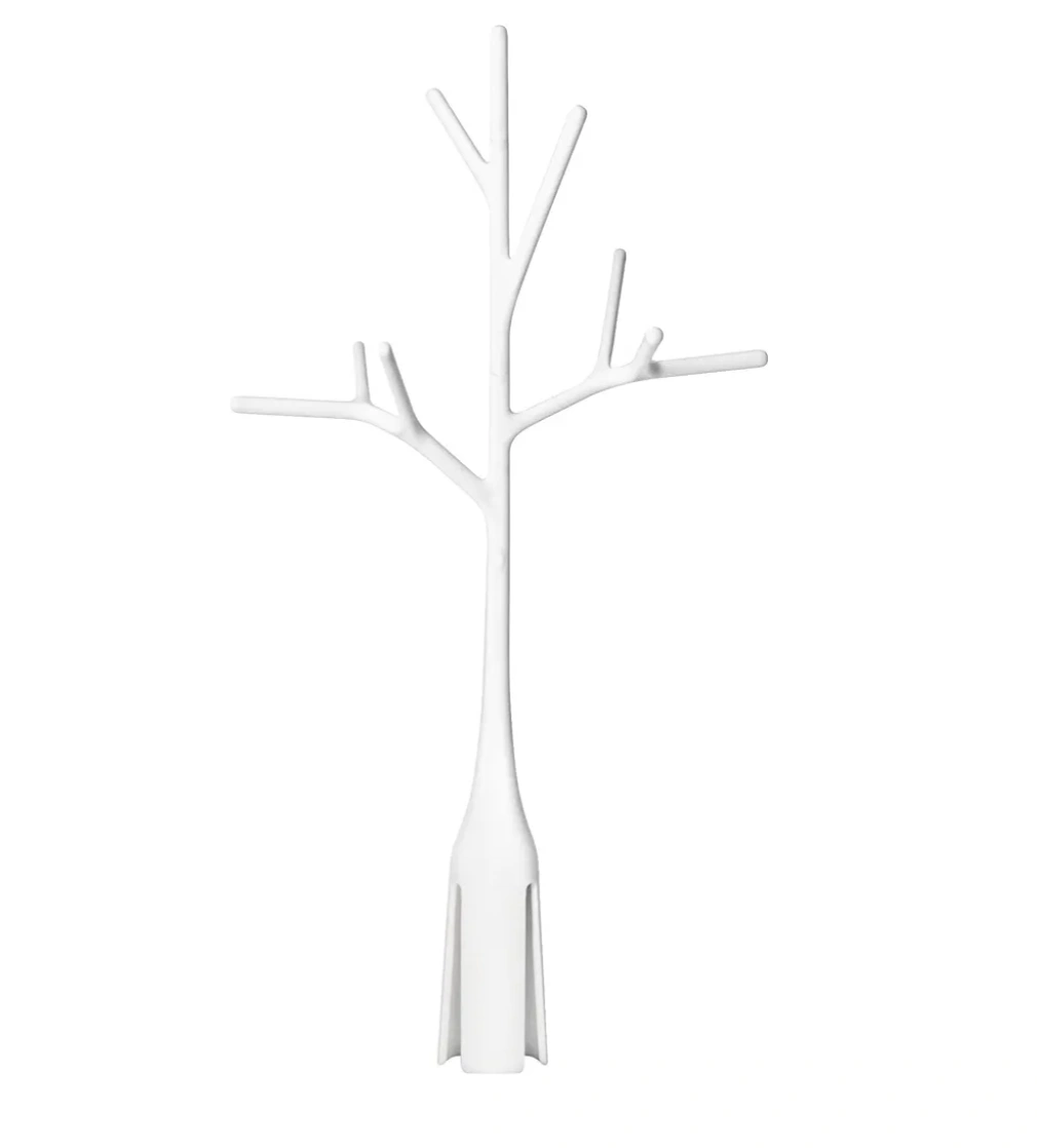 A white Boon Lawn countertop drying rack for bottles and other baby items. It includes a tree for hanging items and a large base with bristles to help with drying. It is in great condition. Dimensions: 27.9D x 34.3W x 6.4H cm