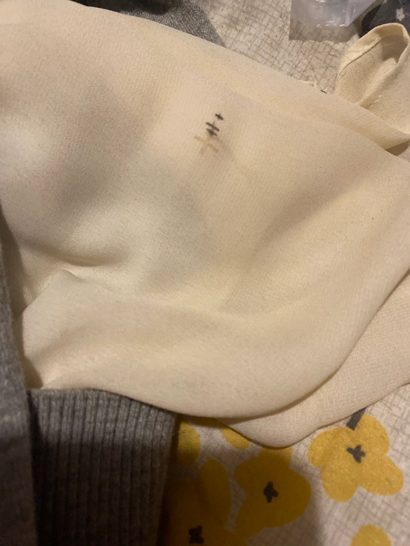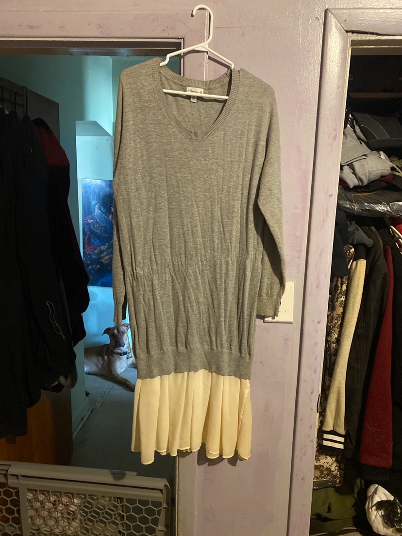 Long-sleeved sweater dress with a layered skirt. The sweater is a grey colour and the skirt is a cream colour. There is a small mark on the skirt. freecycle I have to much stuff