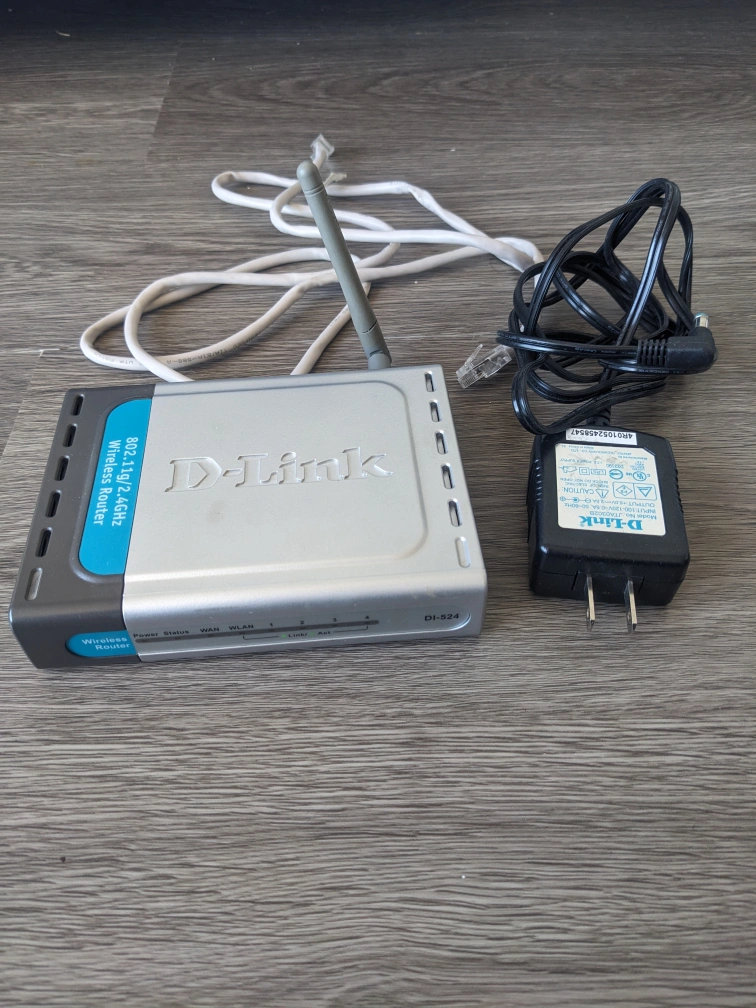 D-Link DI-524 Wireless Router with power adapter and antenna.