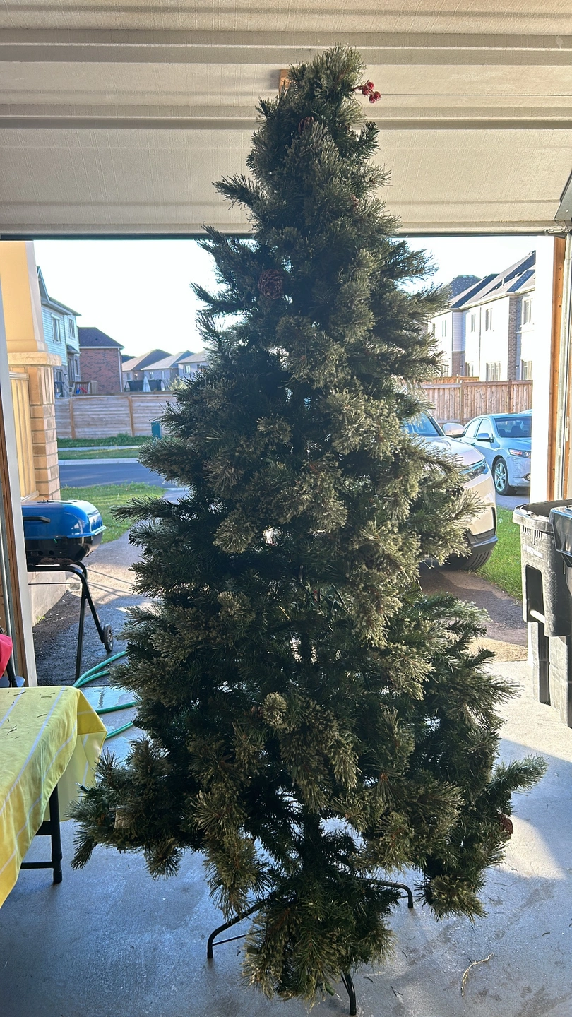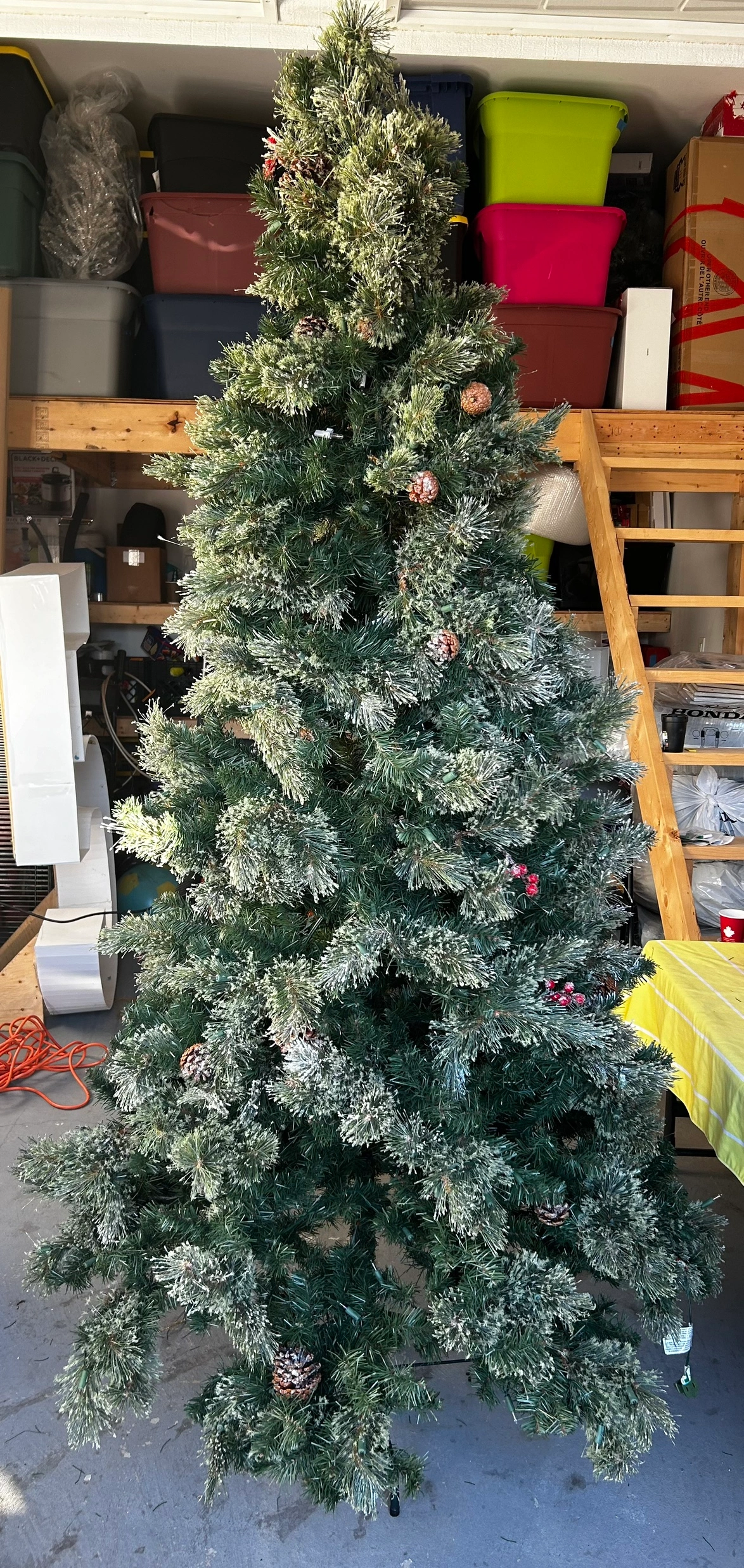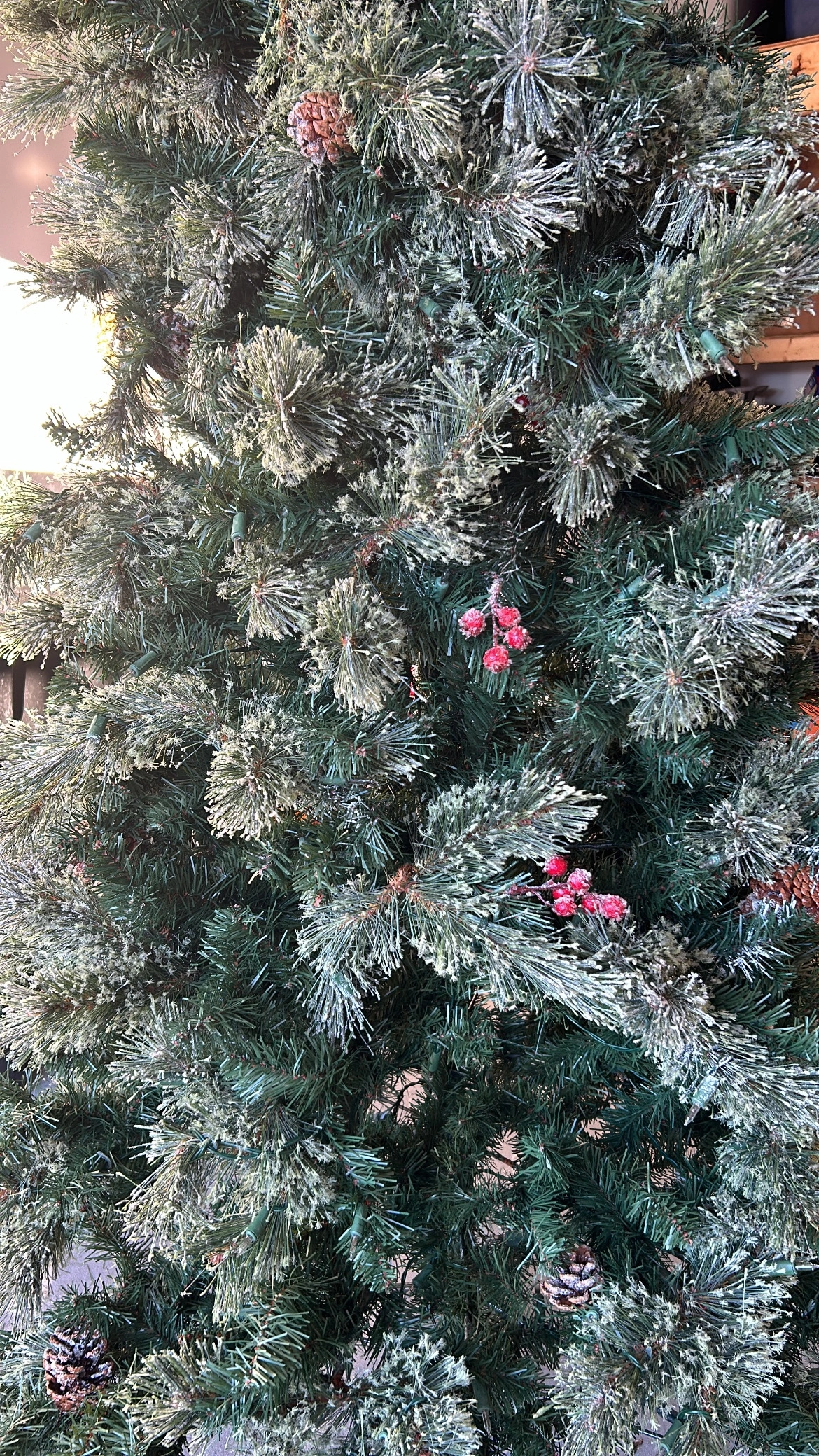 This is a pre-lit flocked artificial Christmas tree with red berries and pine cones. The tree is about 7.5 feet tall.