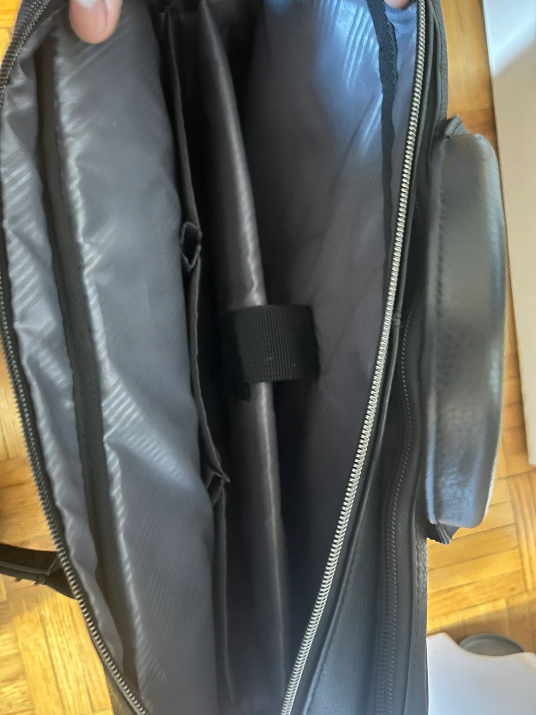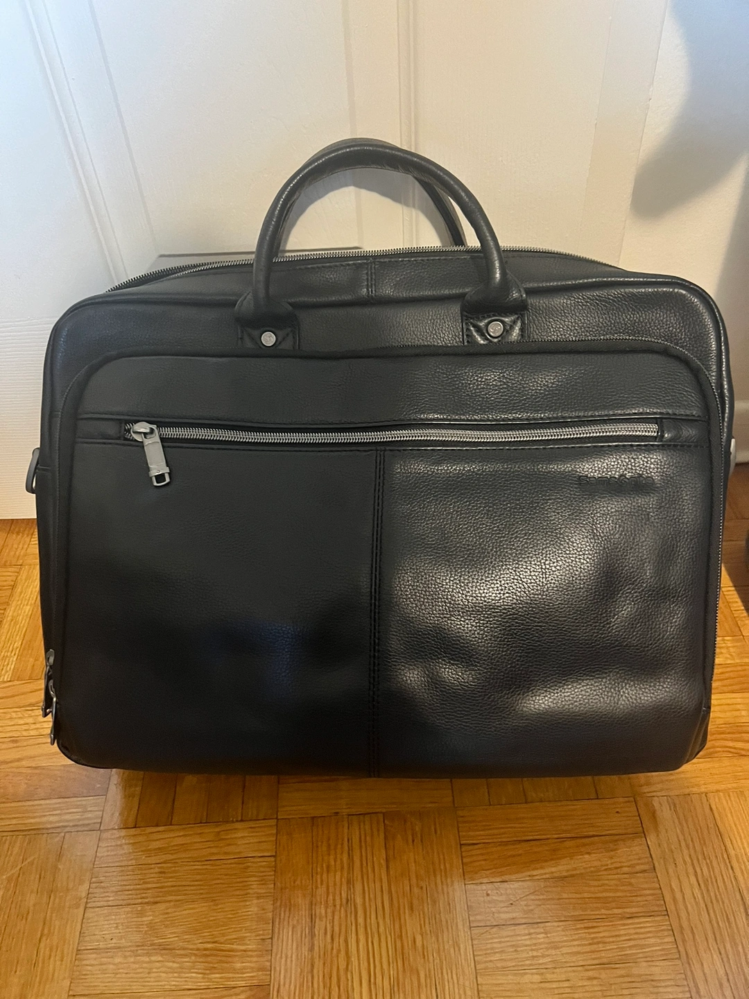 A black leather briefcase in great condition. It has a zippered pocket on the front, a zippered pocket on the side, and a spacious interior with a padded laptop sleeve. It also have a shoulder strap