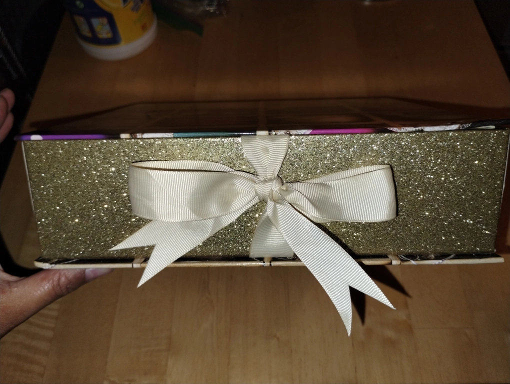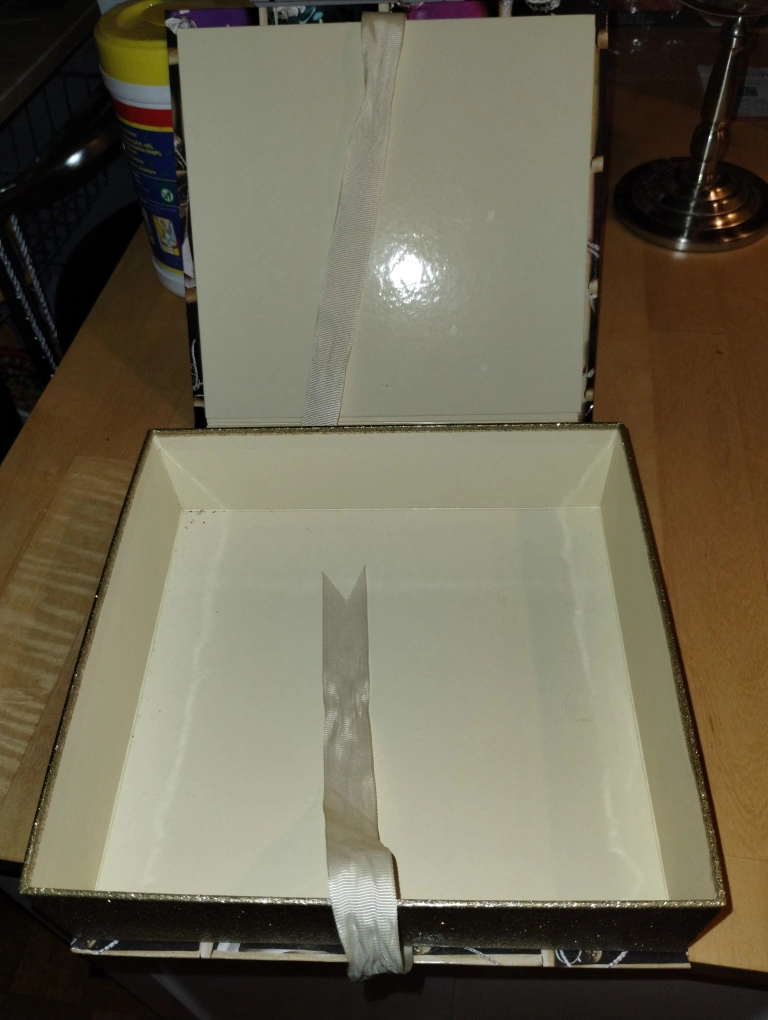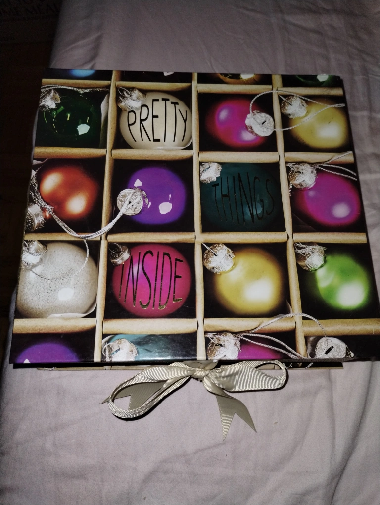A gold glitter storage box with a satin ribbon closure, and the words "Pretty Things Inside" printed on the front. The lid has a gold glitter design on the inside. The box is empty.