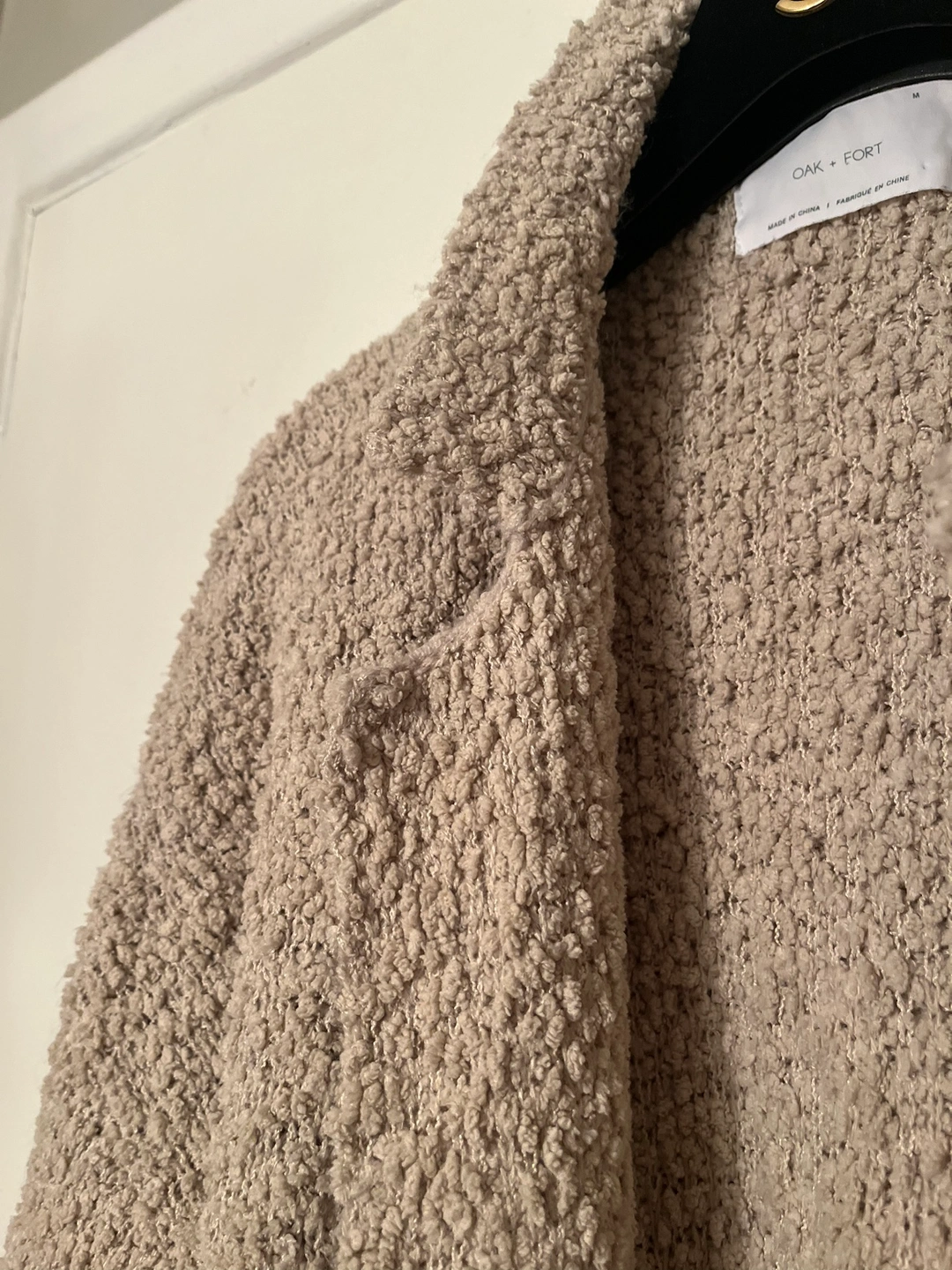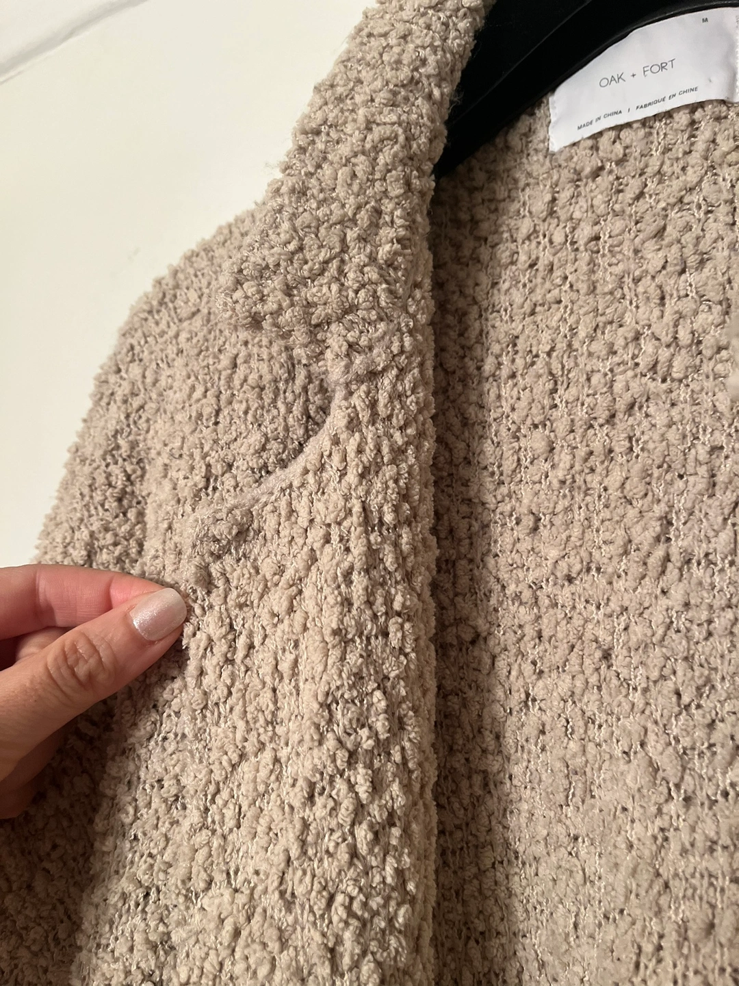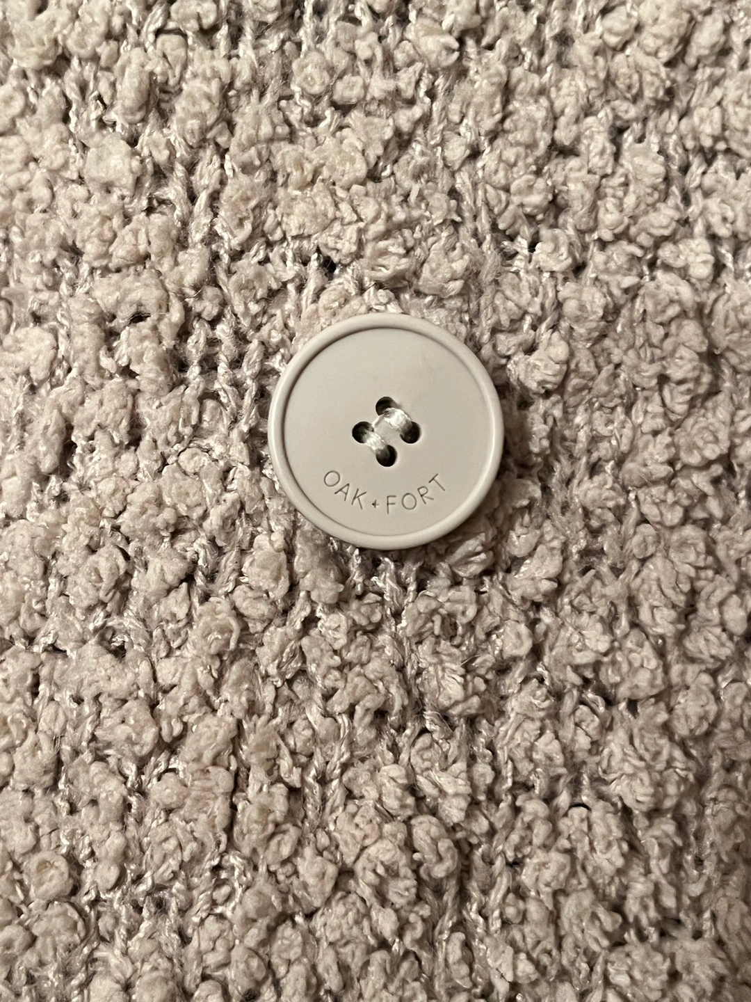 This is a long-sleeved cardigan from Oak + Fort in a beige colour. It is made of a soft, fuzzy material and features a button closure. The cardigan is in size M.