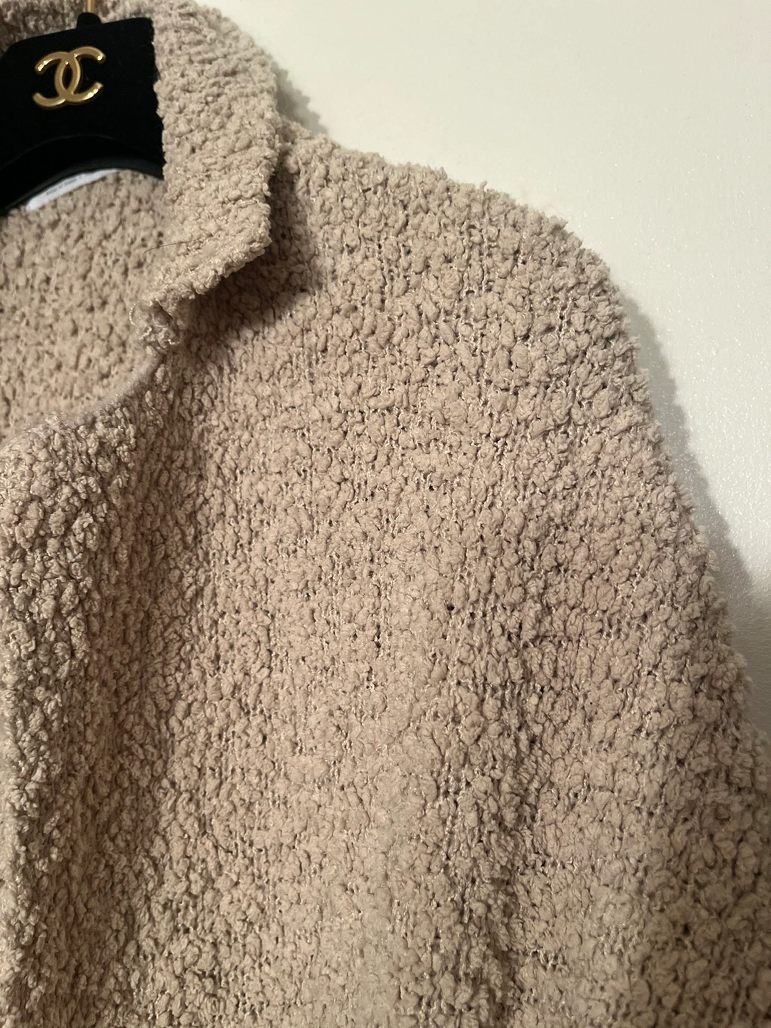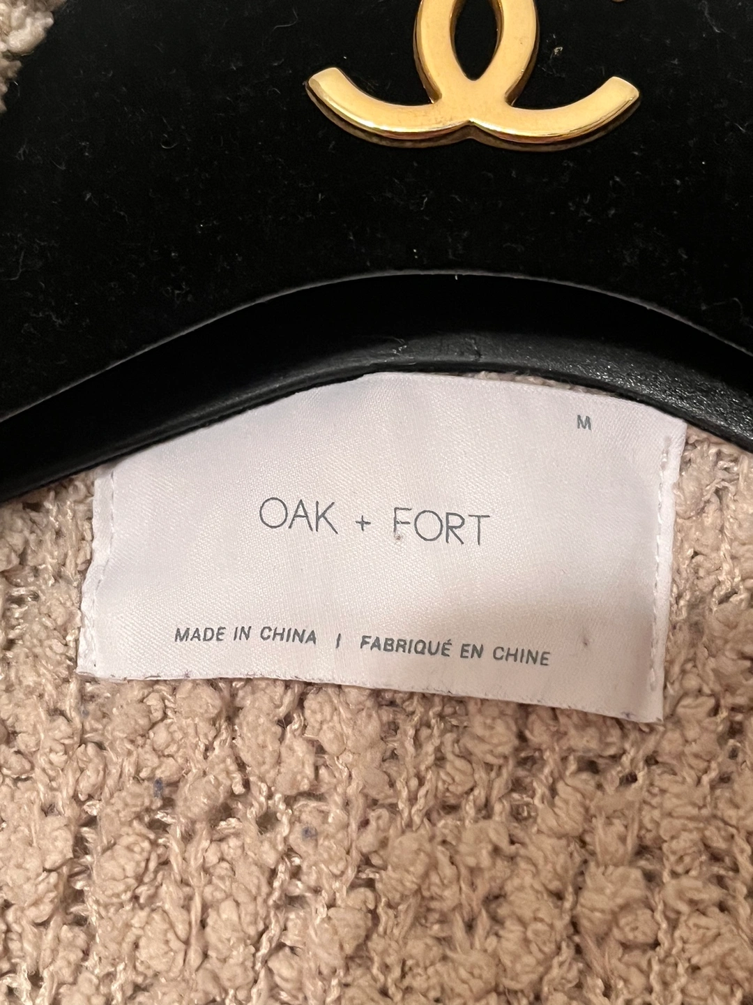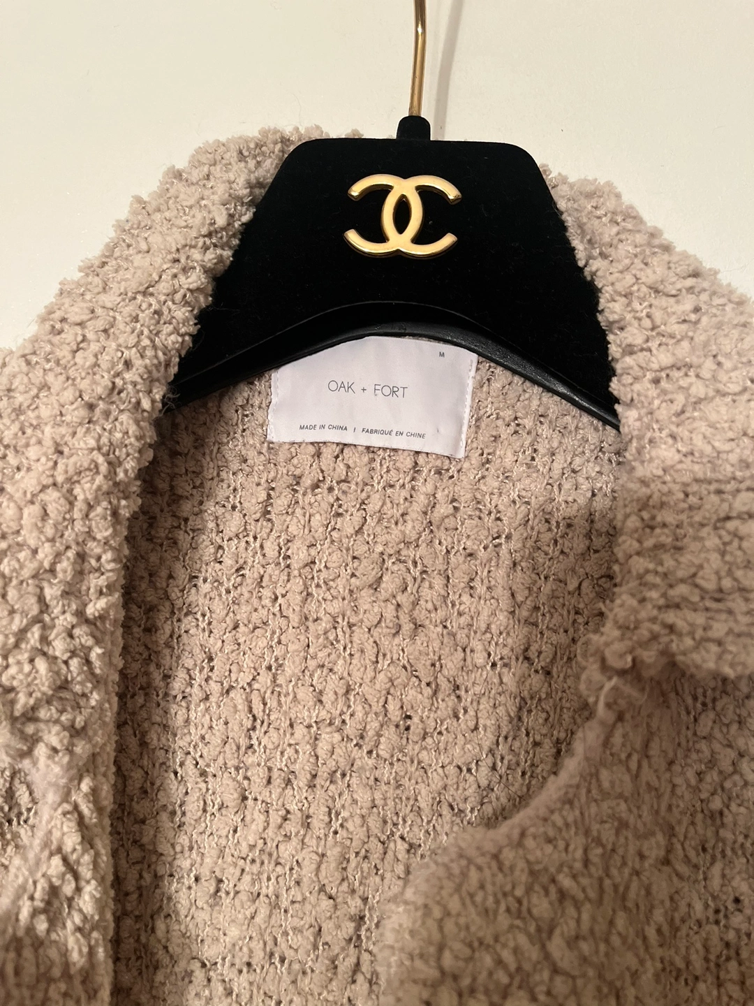 This is a long-sleeved cardigan from Oak + Fort in a beige colour. It is made of a soft, fuzzy material and features a button closure. The cardigan is in size M.