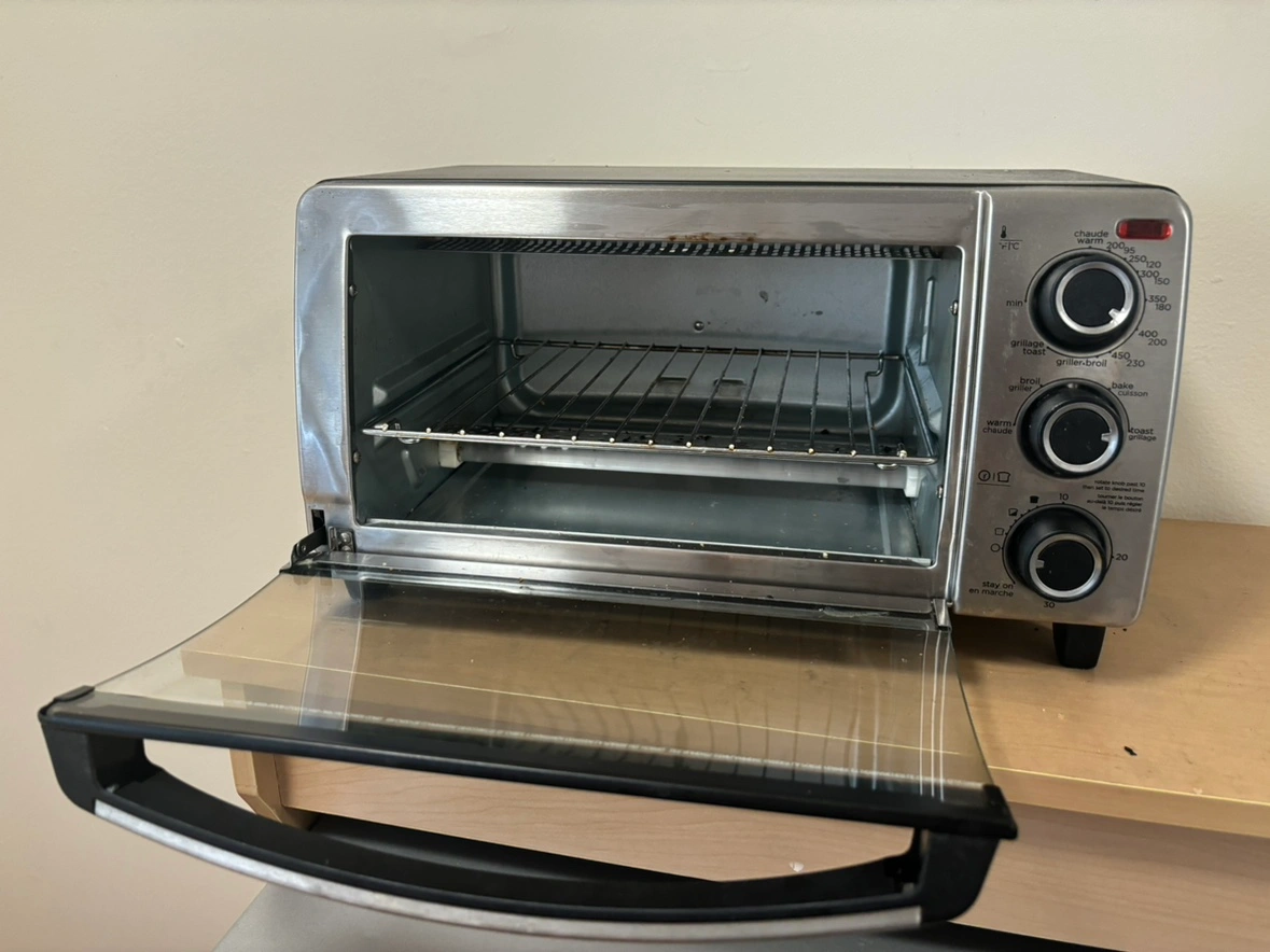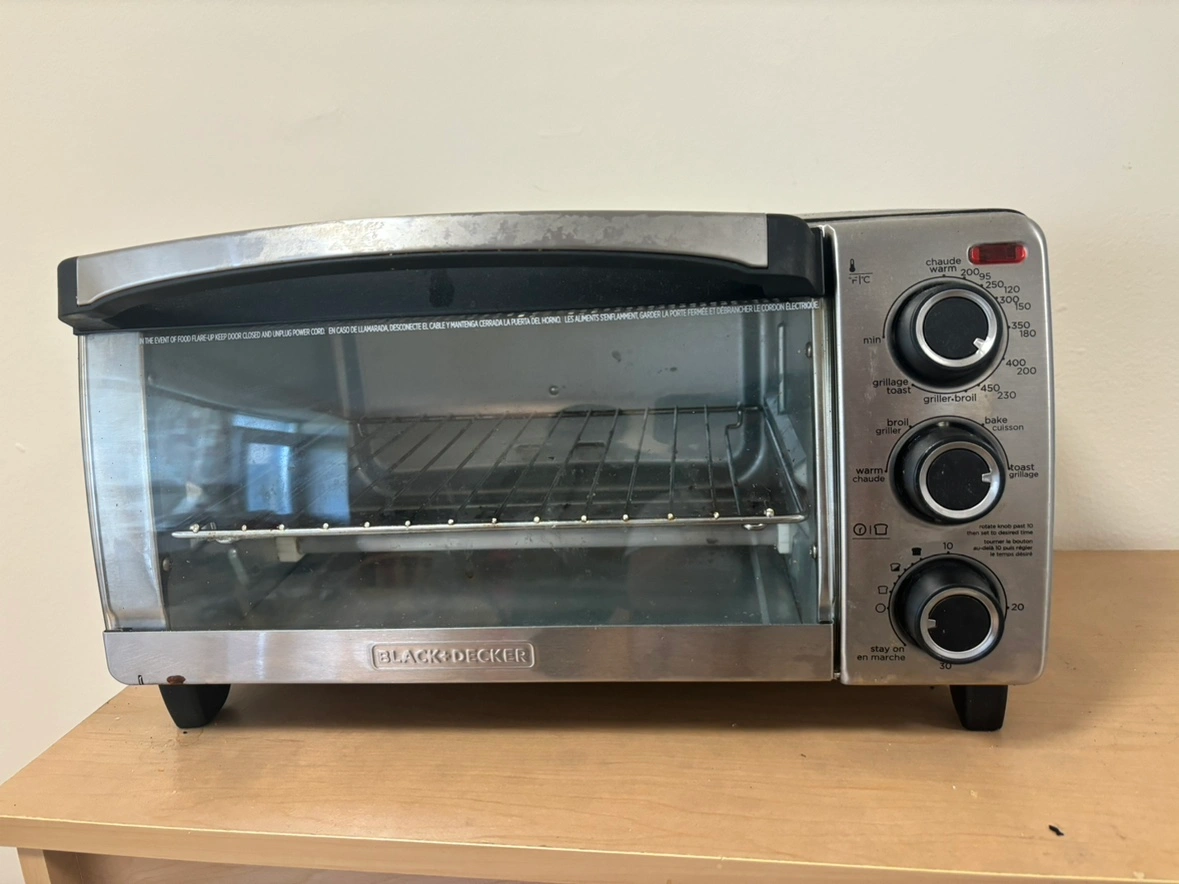 Black + Decker toaster oven in good condition. Includes a baking rack and a removable crumb tray. It has settings for toast, bake, broil, and keep warm. The door features a tempered glass window. The toaster oven is 4-slice capacity. The toaster oven comes with a power cord and plug.