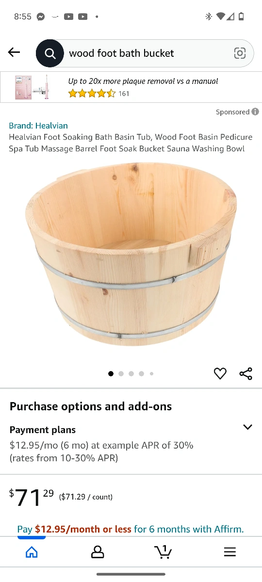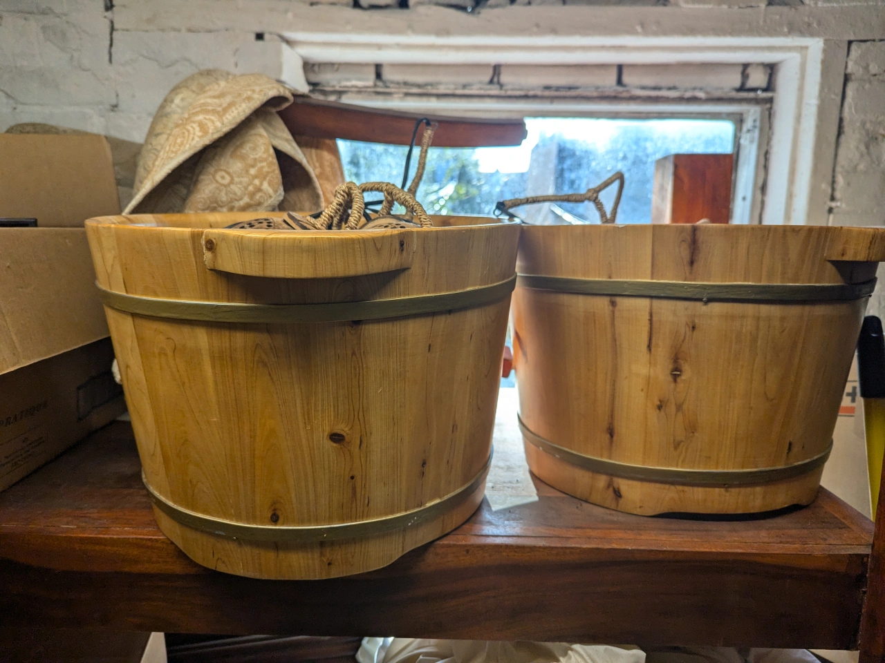Wooden foot bath bucket with massage nubs on the bottom. Great for soaking your feet in warm water to relax and relieve stress. Comes with a metal band around the middle to add stability.