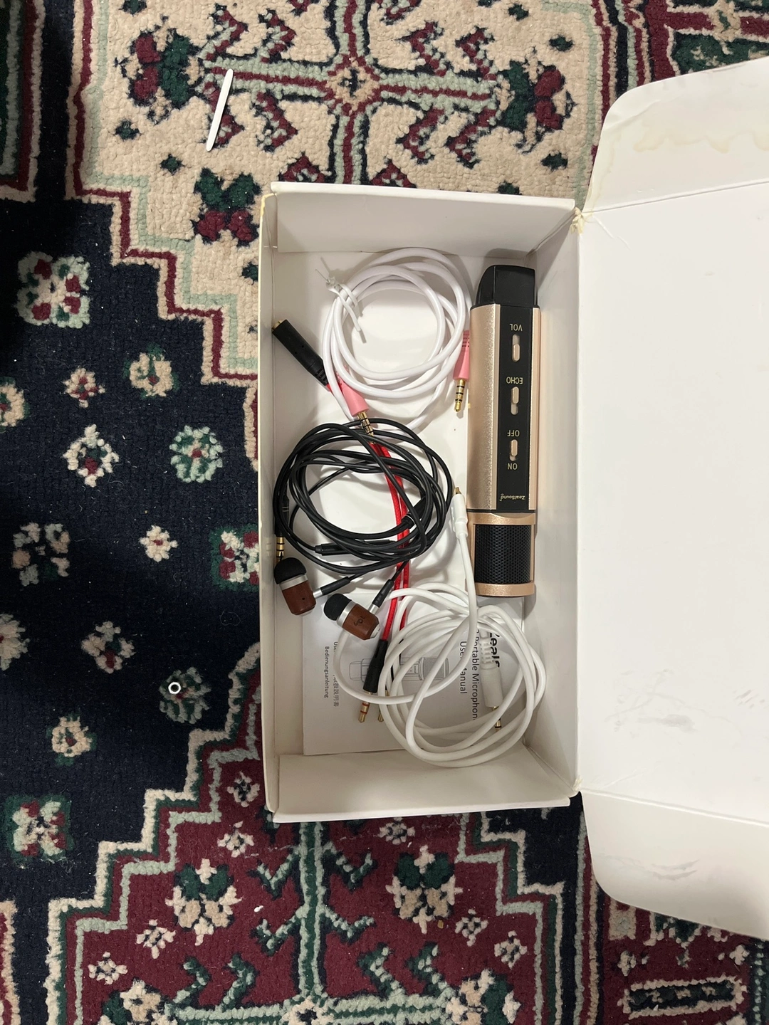The microphone is gold coloured with a black handle and comes with a variety of cords and accessories. #freecycle