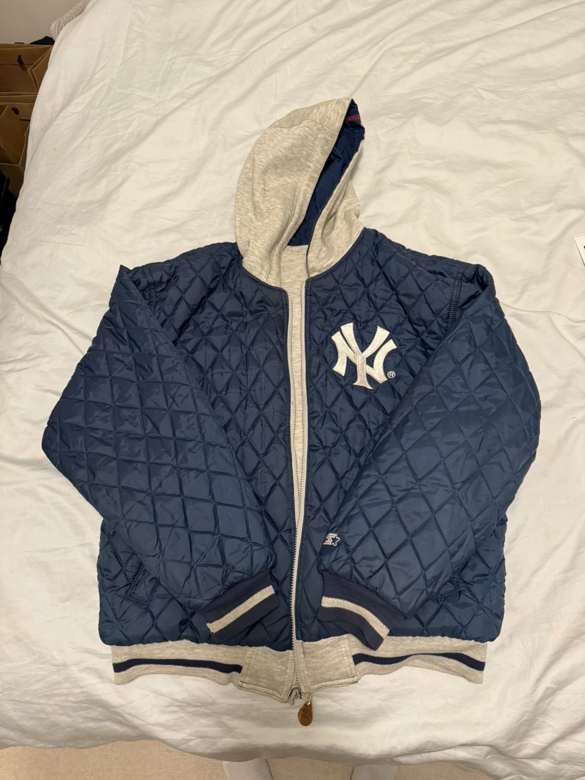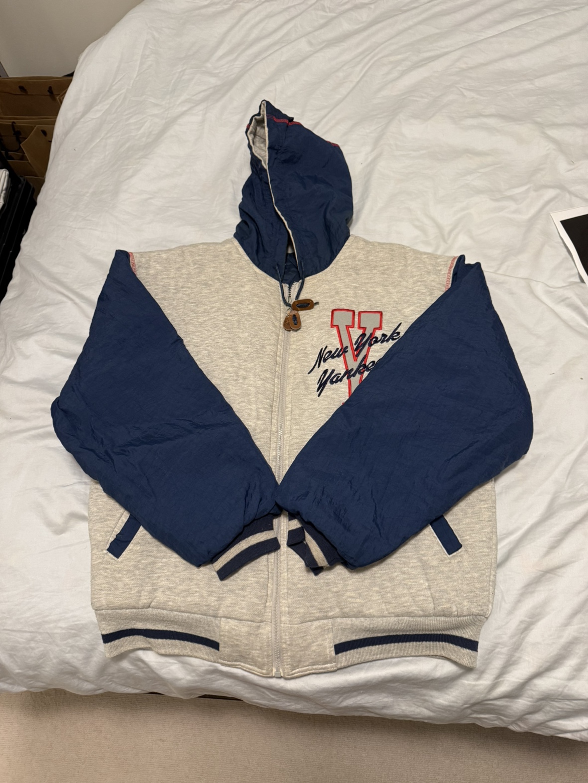 Reversible jacket featuring the New York Yankees logo on one side and "New York Yankees" written on the other.