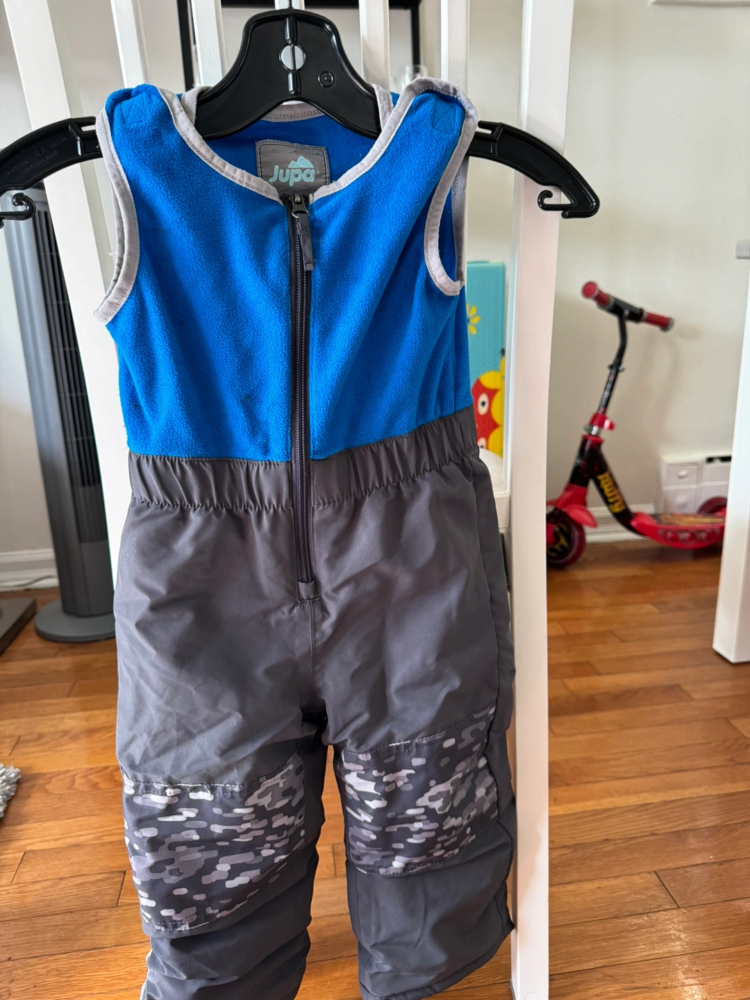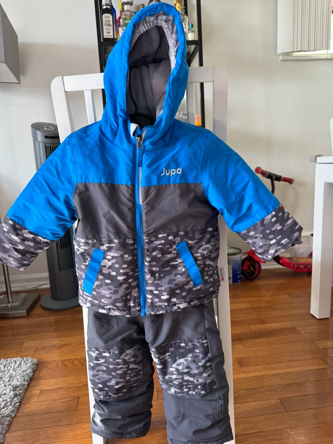 153Blue and gray snowsuit with a camo pattern.size 24 months