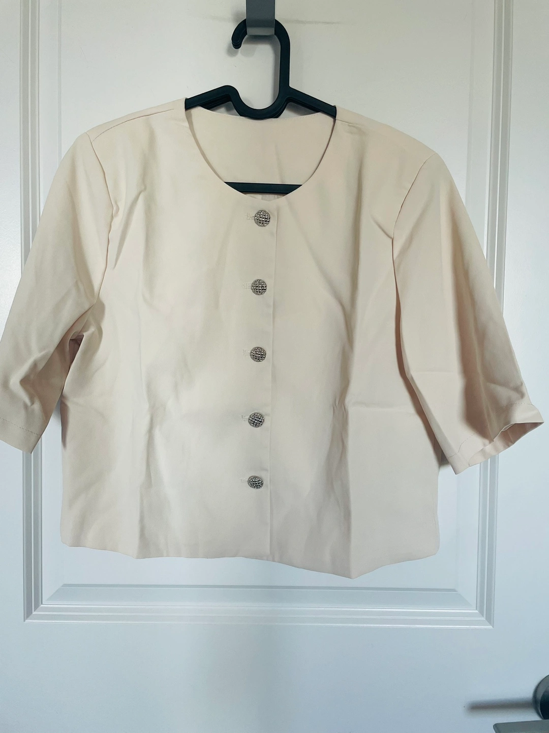 Short-sleeved top with a round neckline and button closures. The top is a cream colour with silver-tone buttons. The sleeves are 3/4 length.
