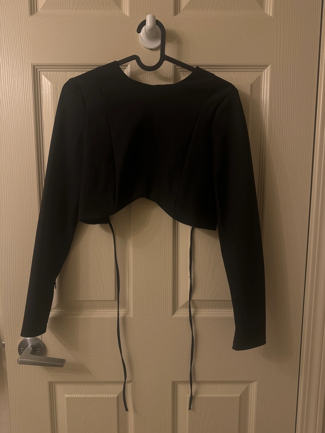 A black long sleeve crop top with a cutout in the back that ties. The top has a round neckline and a fitted silhouette. Discount on Bundles. Great for going out.