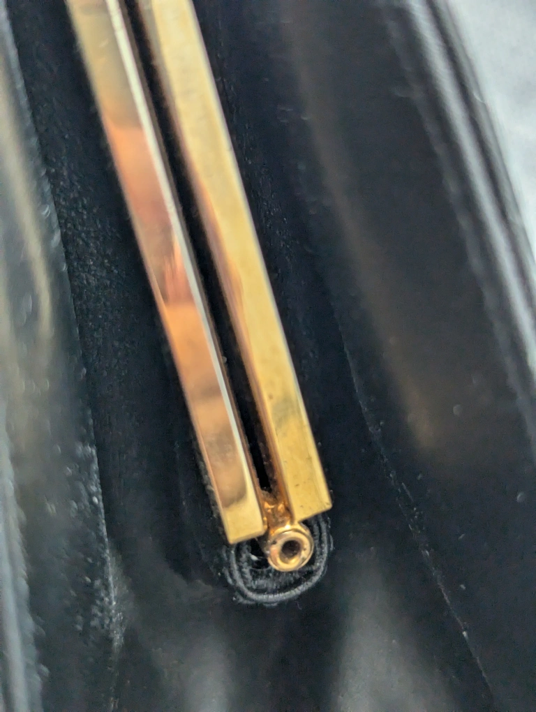 Genuine black leather shoulder bag with gold washed hardware. The bag has a flap closure that holds 2 additional slots together, and an interior zip pocket. Beautiful authentic vintage piece made in Italy by Valentino Orlandi, which is a different brand from Valentino (Garavani). Gently used.