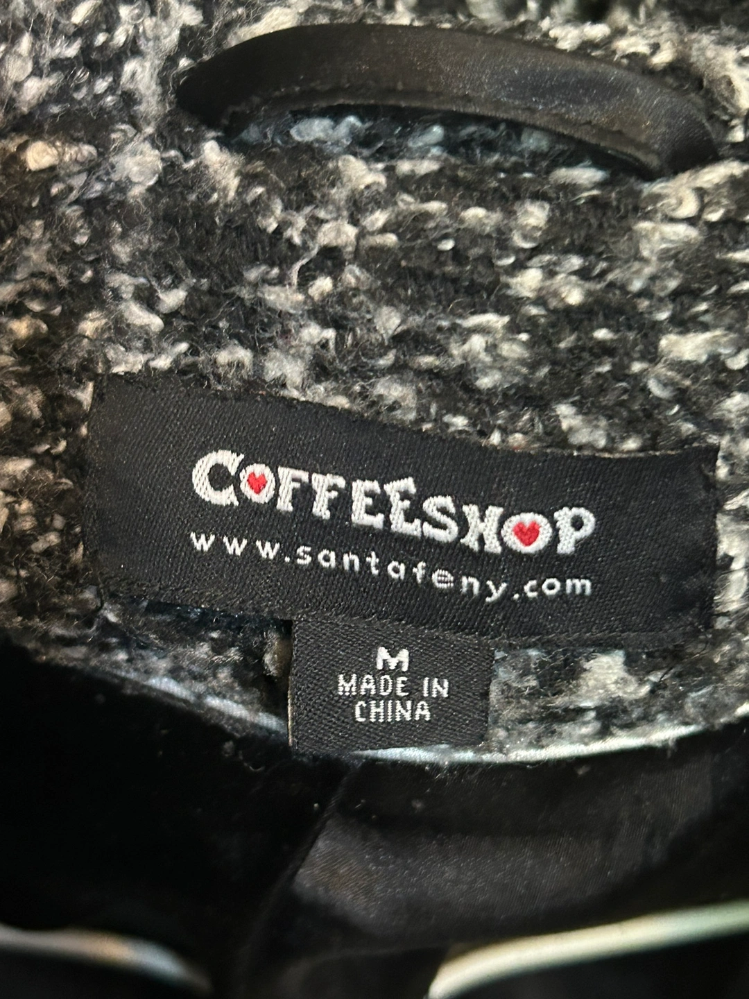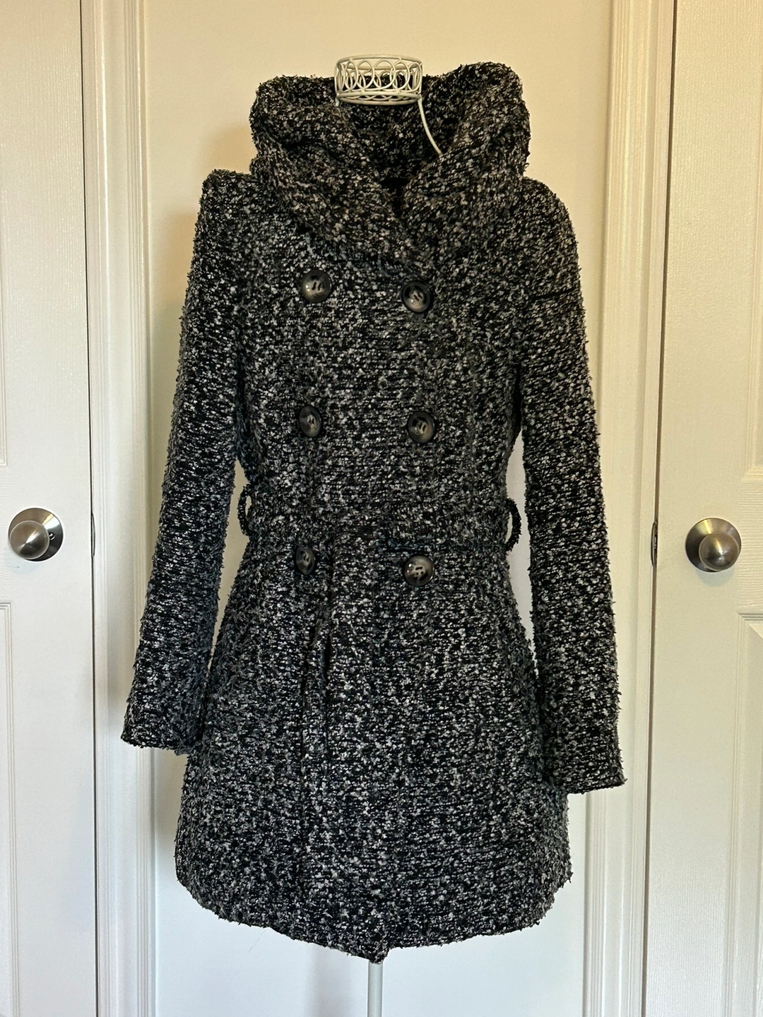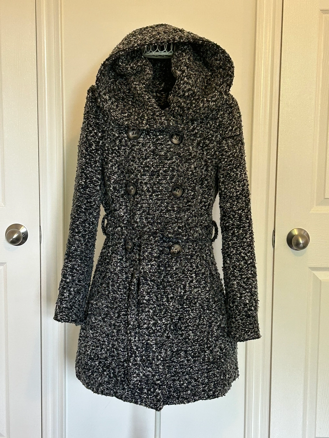 Black and white tweed coat with a hood, double-breasted button closure, and a tie belt. Size M. Made in China. Great for Fall and Winter. Warm and stylish!