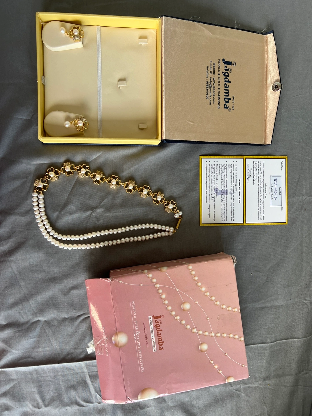 The set comes in its original packaging along with authenticity certificate. Real authentic premium pearls necklace set with matching earrings. I can share more pics of jewellery and authentic certificate if needed.