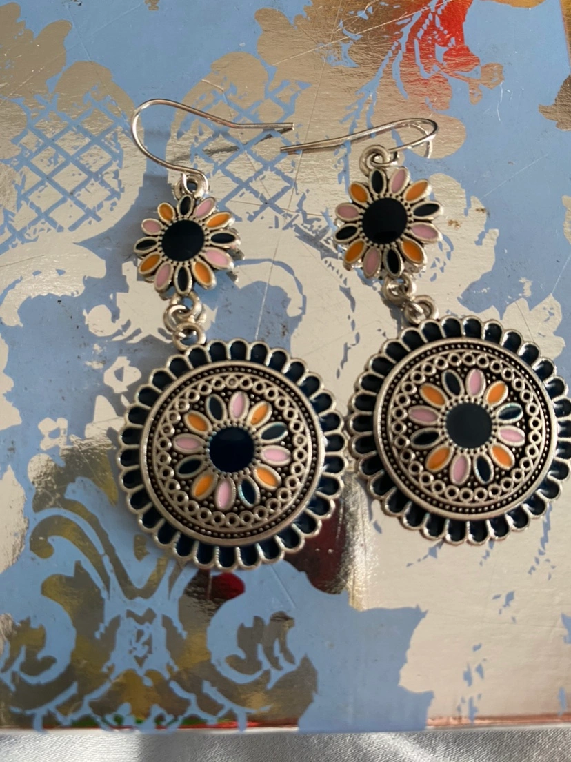 These are drop earrings with a large round pendant with a flower design in orange, pink and black. The pendant hangs from a small flower.