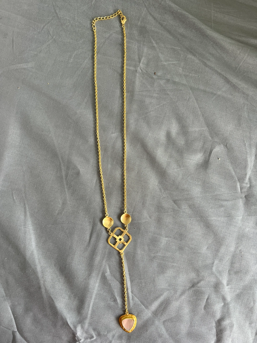 NEW Gold chain necklace with a white pearl finish triangle stone pendant. The pendant features a geometric design. The necklace is approximately 20 inches
