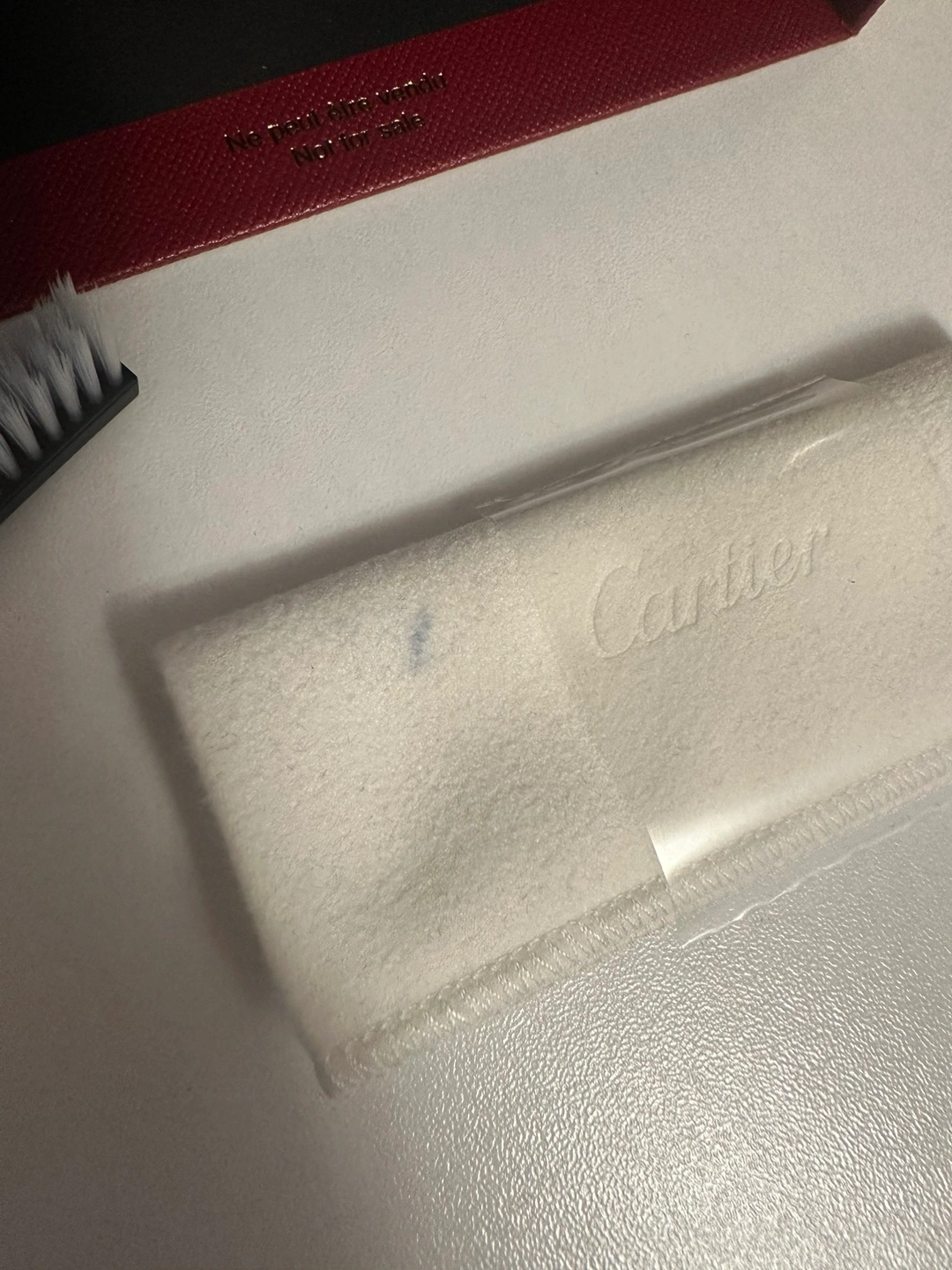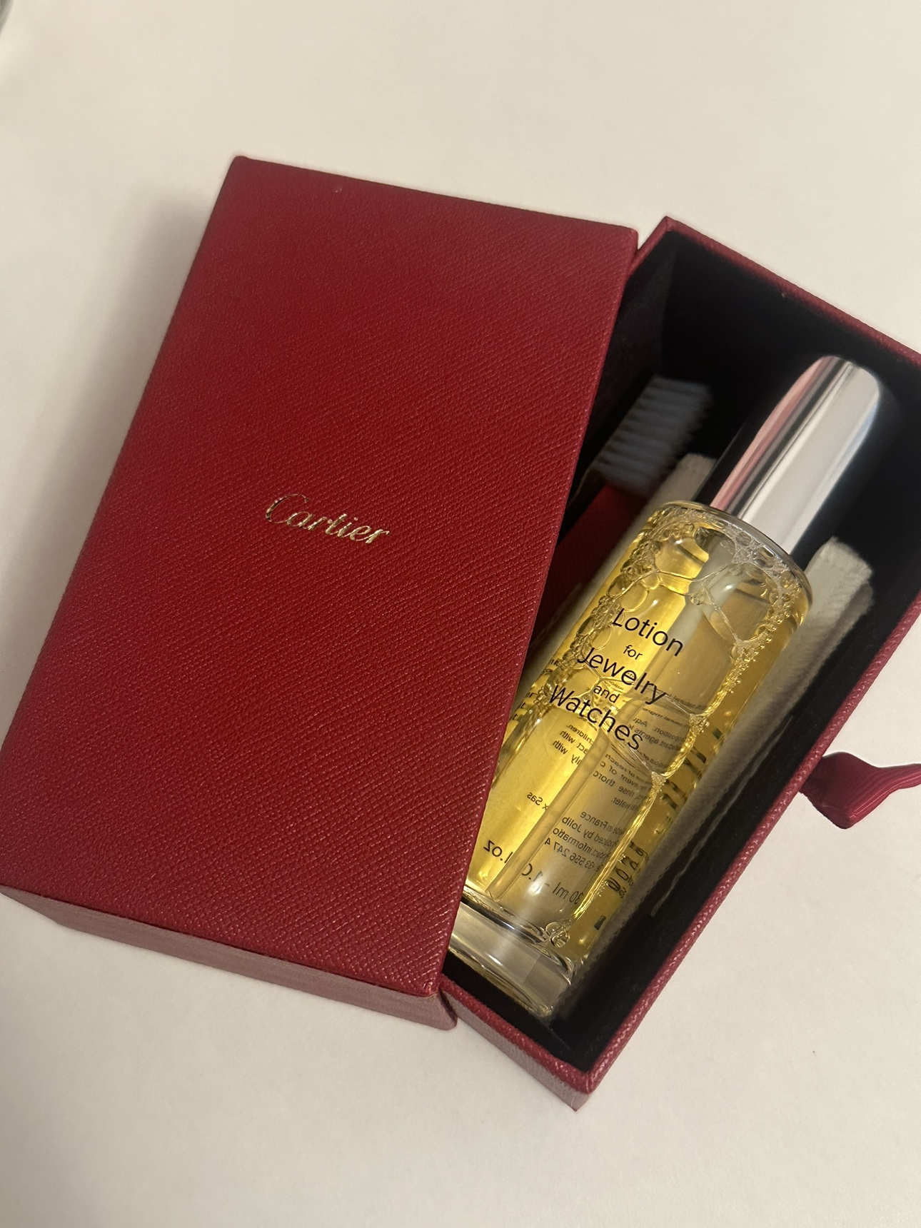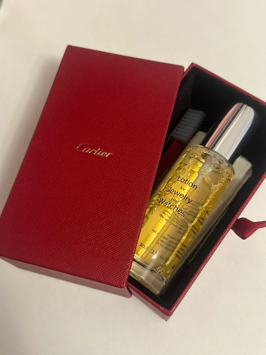 Lotion for Jewelry and Watches by Cartier, comes with a brush, cleaning cloth, and booklet. Comes in the original Cartier box. The lotion is 30ml. Only available with purchase of official Cartier watches or jewelry. The lotion has been used but the brush/cloth have not. SA pen mark on the top of the cloth