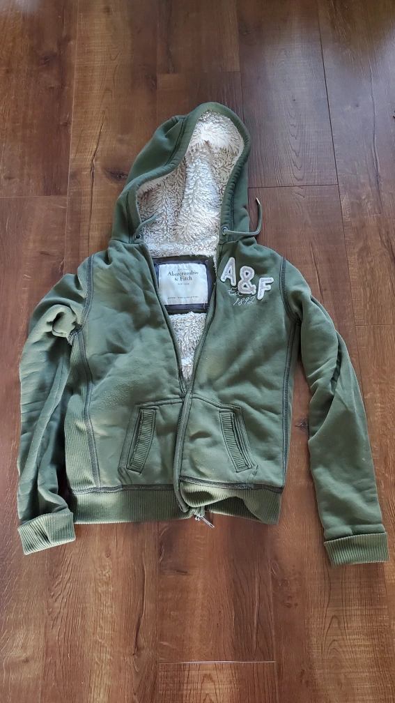Green zip-up hoodie with white fleece lining. It features the A&F logo on the chest and a patch on the left sleeve.