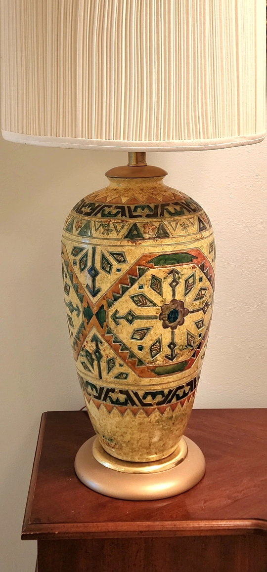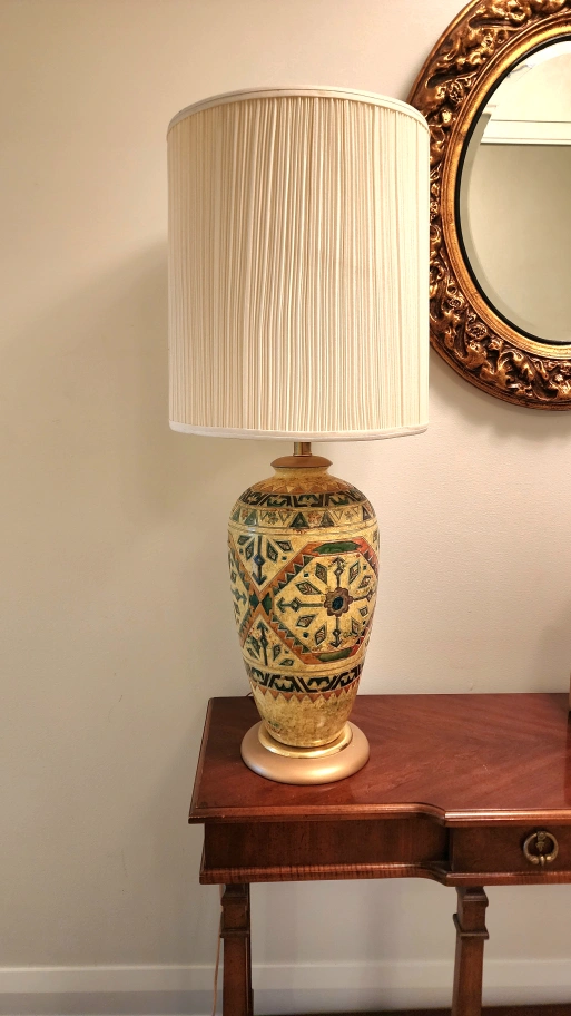 This is a beautiful mid-century style ceramic table lamp with a cream-coloured shade. The body has ornate inlays in shades of green, brown, orange, and yellow in detailed patterns.