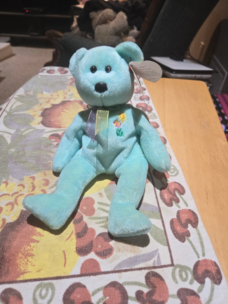 A Ty Beanie Baby named Ariel with a blue body and a multicoloured ribbon.