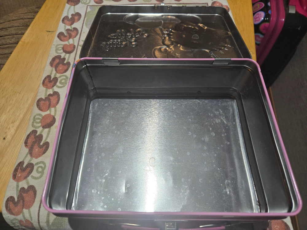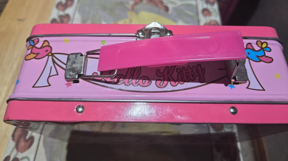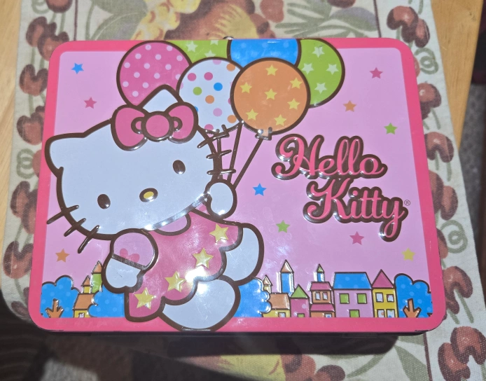 This is a vintage Hello Kitty tin lunchbox. It has a pink finish with an image of Hello Kitty holding balloons. The lid has a handle and a latch. The lunchbox is empty and ready to be used for all of your storage needs! It would be great for a small collection of items, or even as a small pencil holder. There are some minor scratches and scuffs on the outside of the box. The inside is clean.