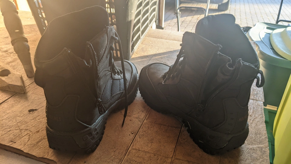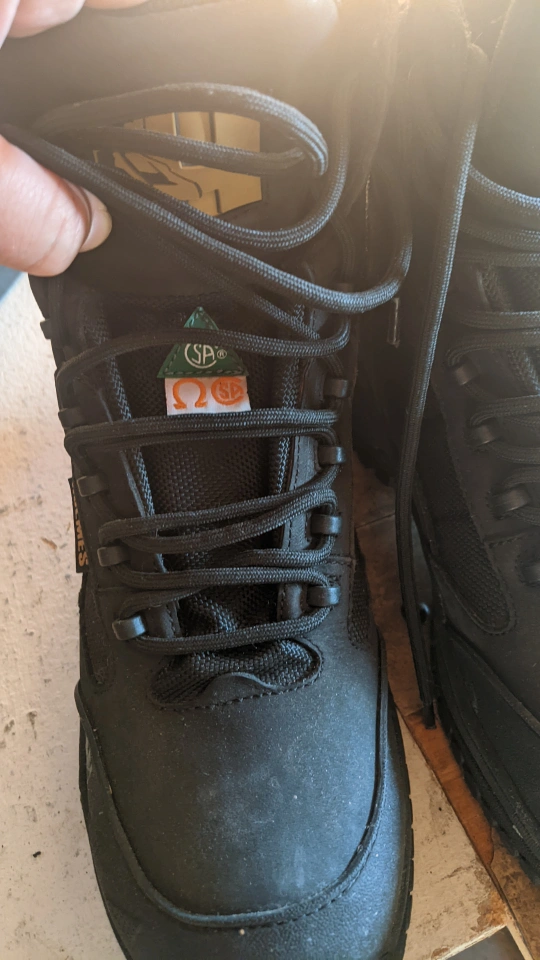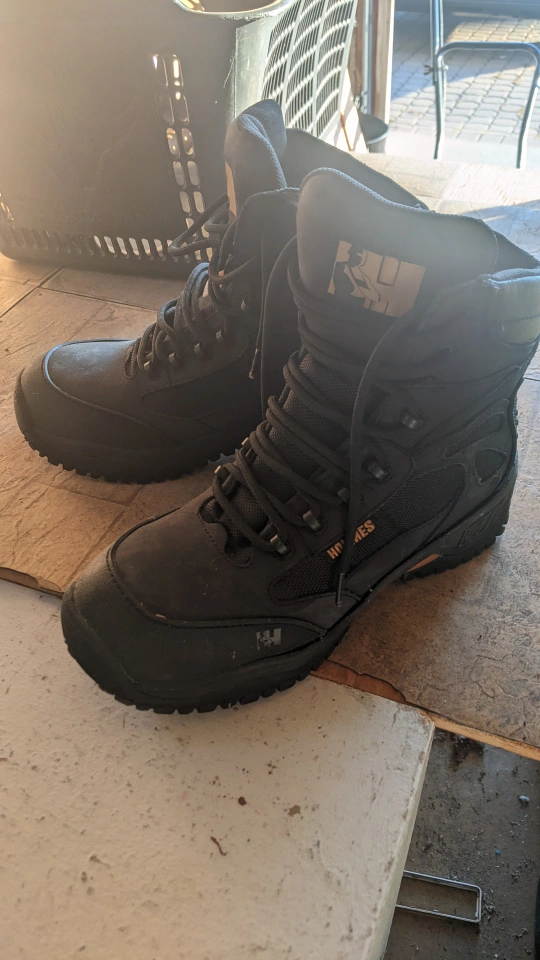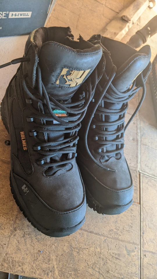 232Men's/women's black safety boots. They are in great condition and have a steel toe with green triangle/ohm logo symbol. They were used for 1 occasion and no longer needed. They are a bit on the large end for me (I'm size 7.5-8 ladies) ; they are warm, comfortable, waterproof, convenient, and work well for a wide foot and wide calf. If you have a hard time finding footwear, like I do, I think you'll be pleased with these. Perfect for Halloween if you're looking for a construction/s.w.a.t team/military look.