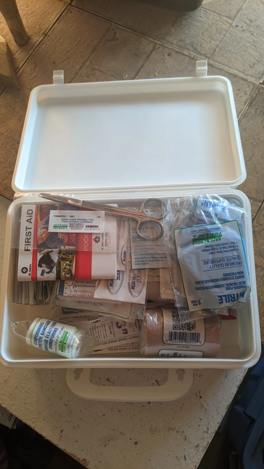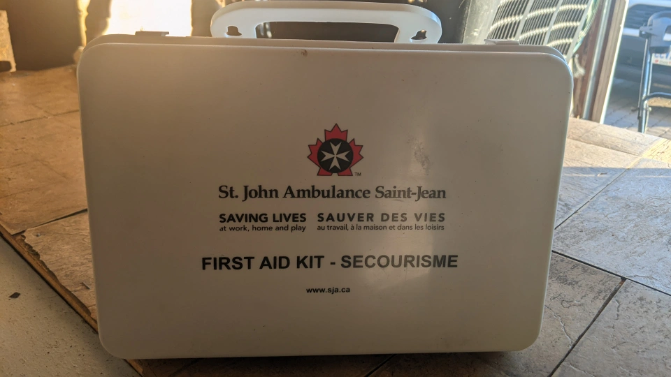 A white plastic first aid kit with a St. John Ambulance logo. It comes with various first aid supplies, including bandages, antiseptic wipes, gauze pads, and more.