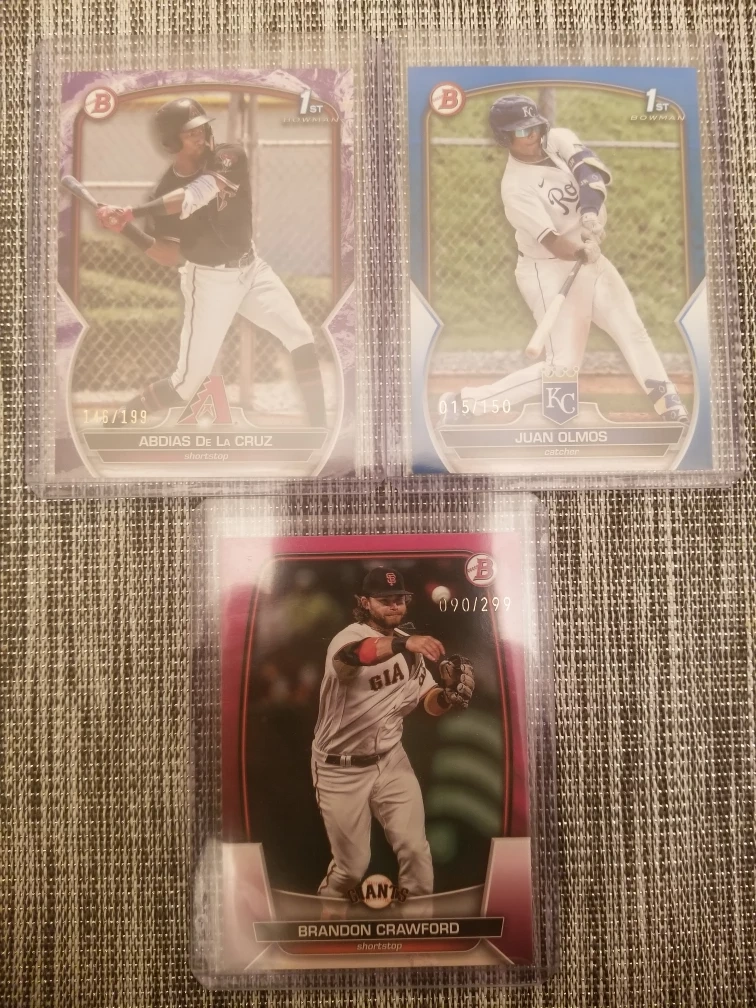 78Set of 3 Bowman baseball cards, one of Abdias De La Cruz, Juan Olmos and Brandon Crawford.