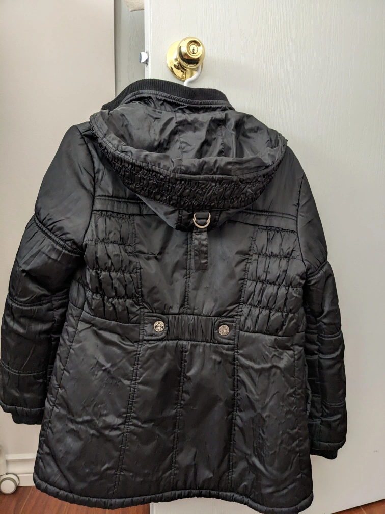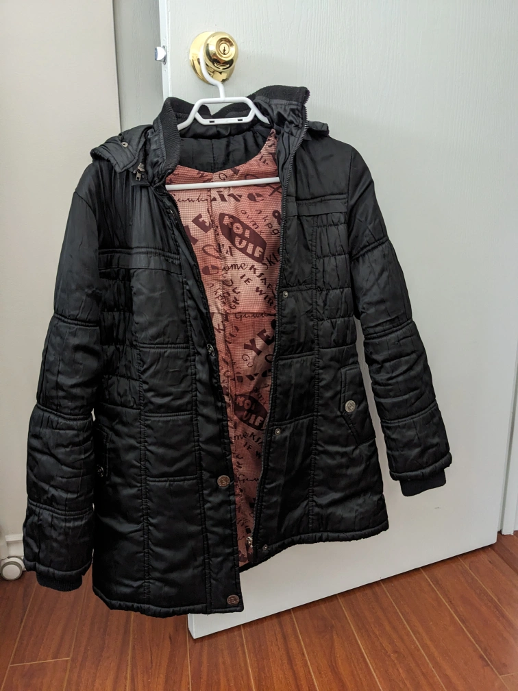 cute thicker puffy jacket perfect for keeping warm during autumn/winter. fits xs-s. has a detachable hood and pockets.