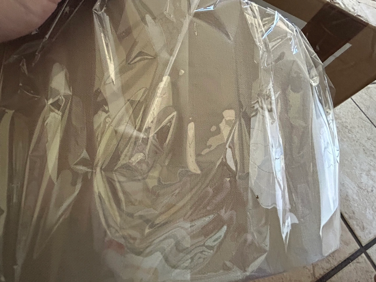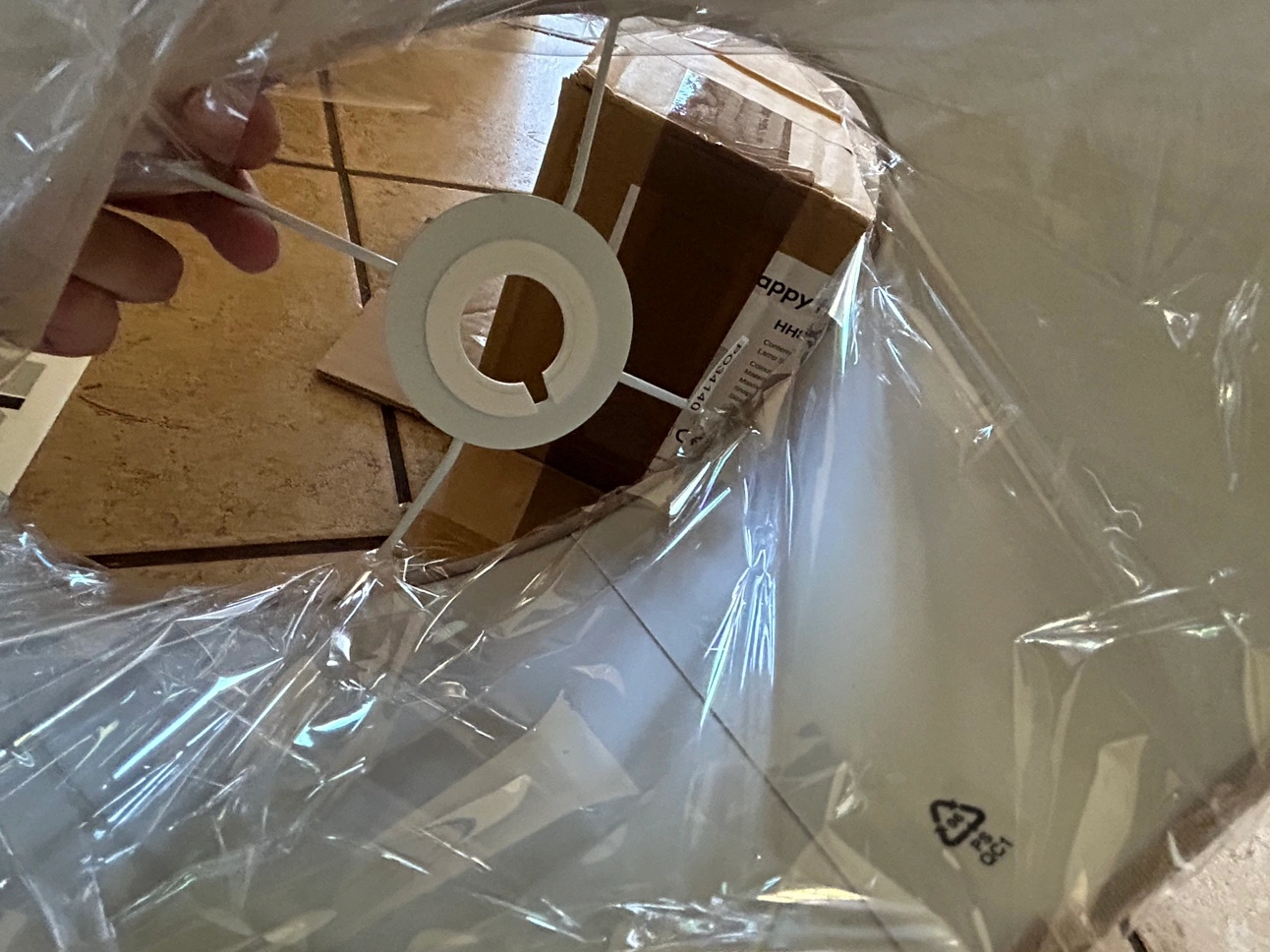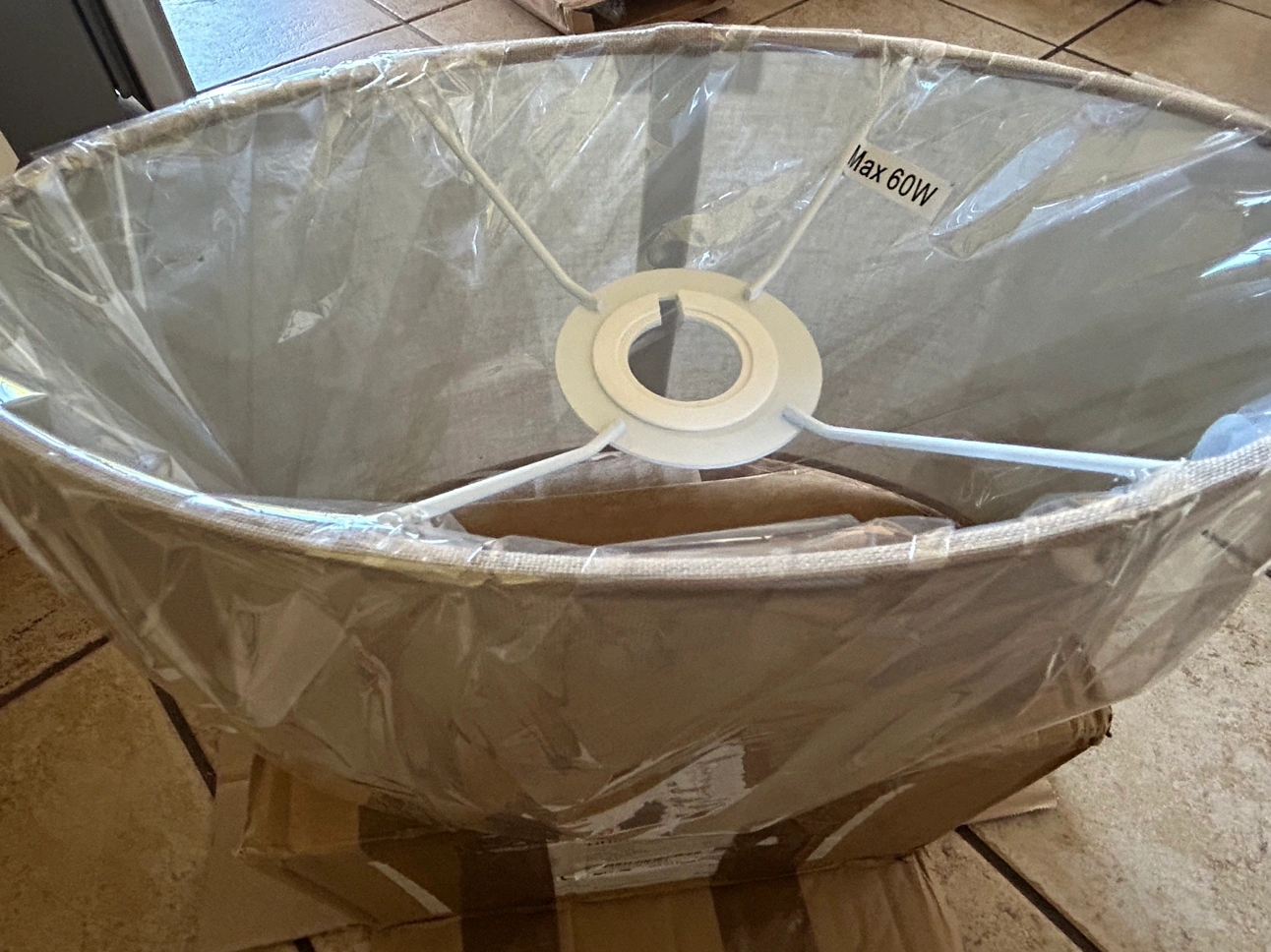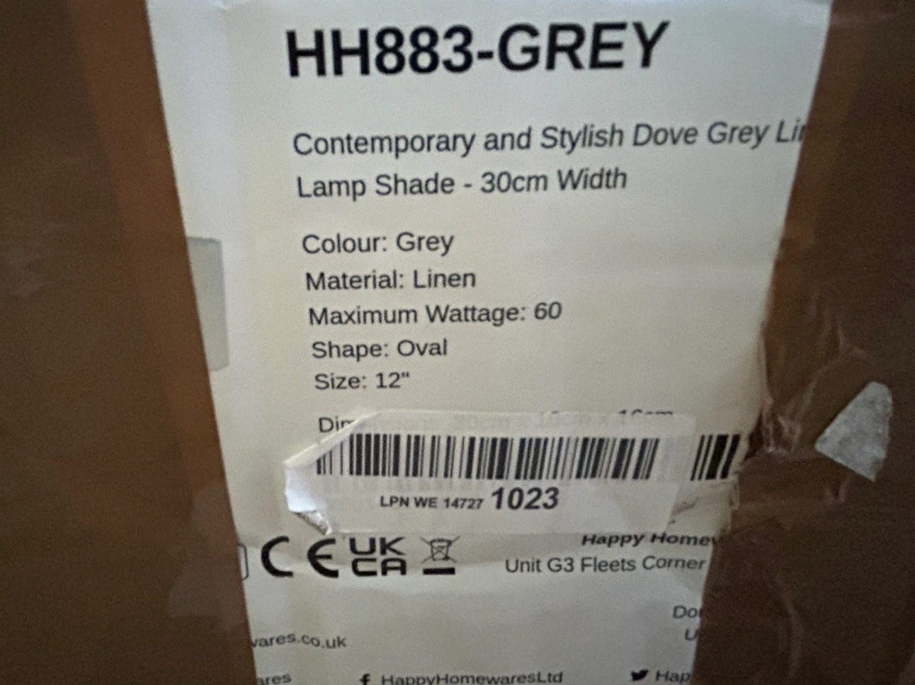 Brand new, though the box is in rough shape from being moved. Still wrapped up in plastic, no dents or scratches. Made of grey linen, with white frame. Includes ring sizer, but no lamp or bulb. Only lamp shade included. This is oval shaped, 12" or 30cm across. 16cm in depth.
