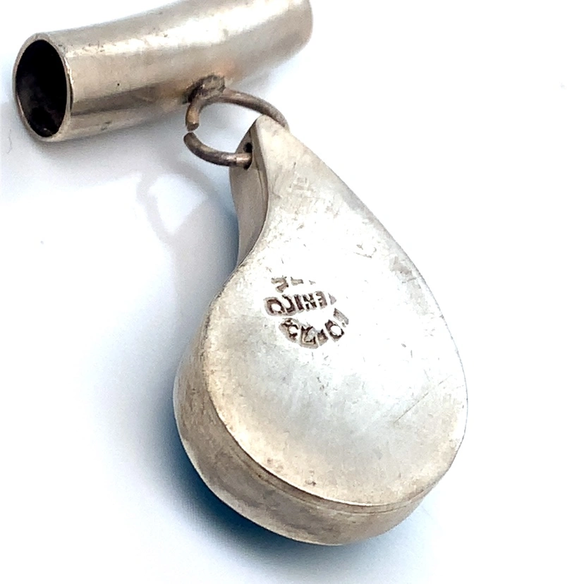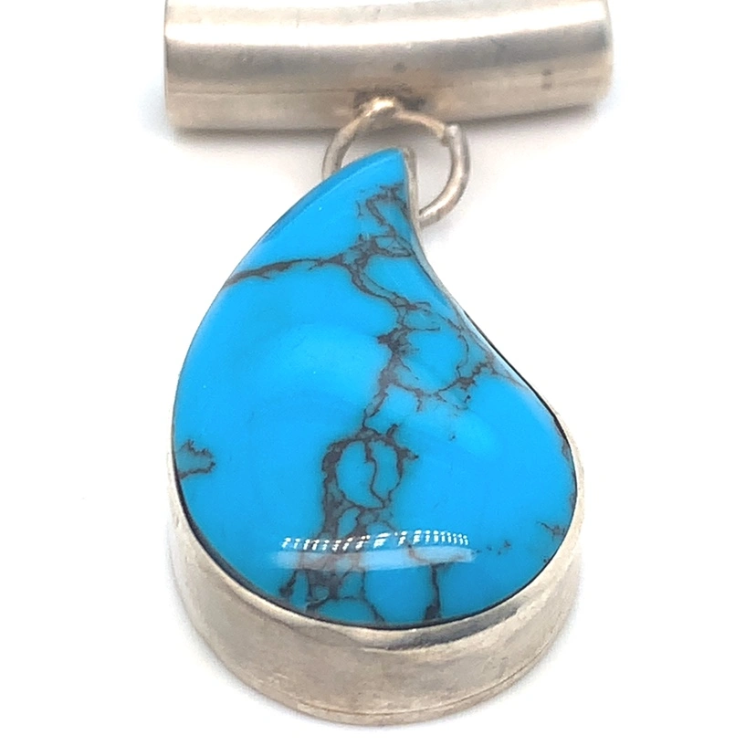 This is a sterling silver pendant with a teardrop-shaped turquoise stone. It is approximately 2 inches long including the bail. The back of the pendant is stamped "925 Mexico".