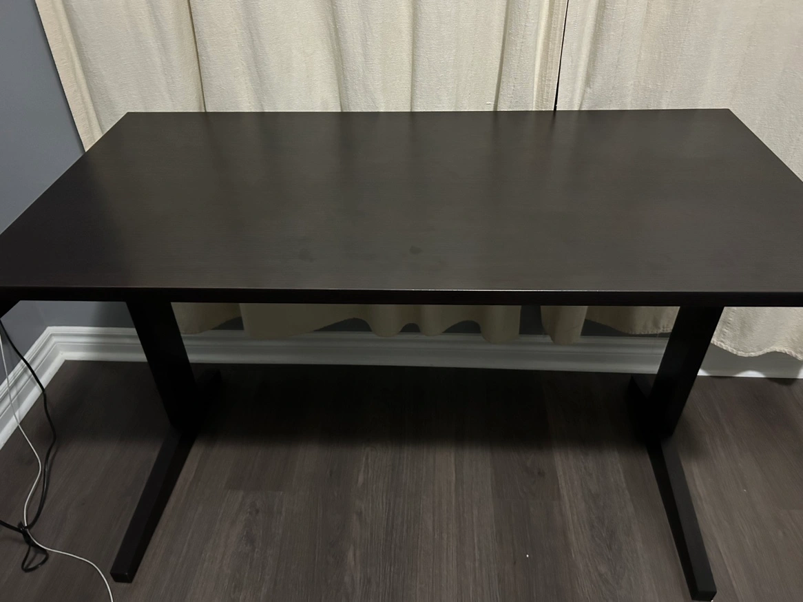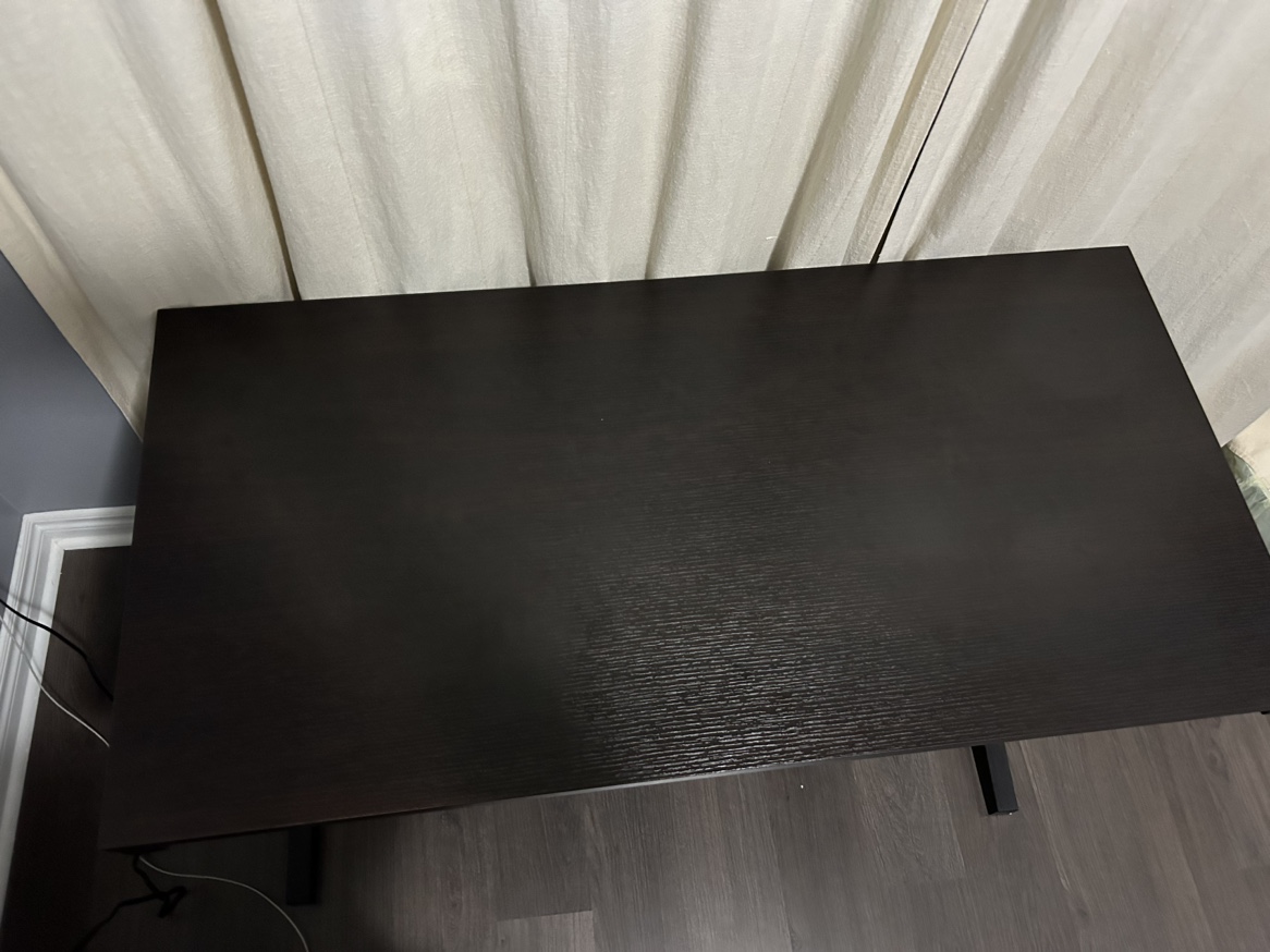 A black desk with a wood-look finish. It has a simple design with a rectangular top and two legs. The desk is in good condition (legs are bit wobbly but can be fixed easily - screws need to be tightened).