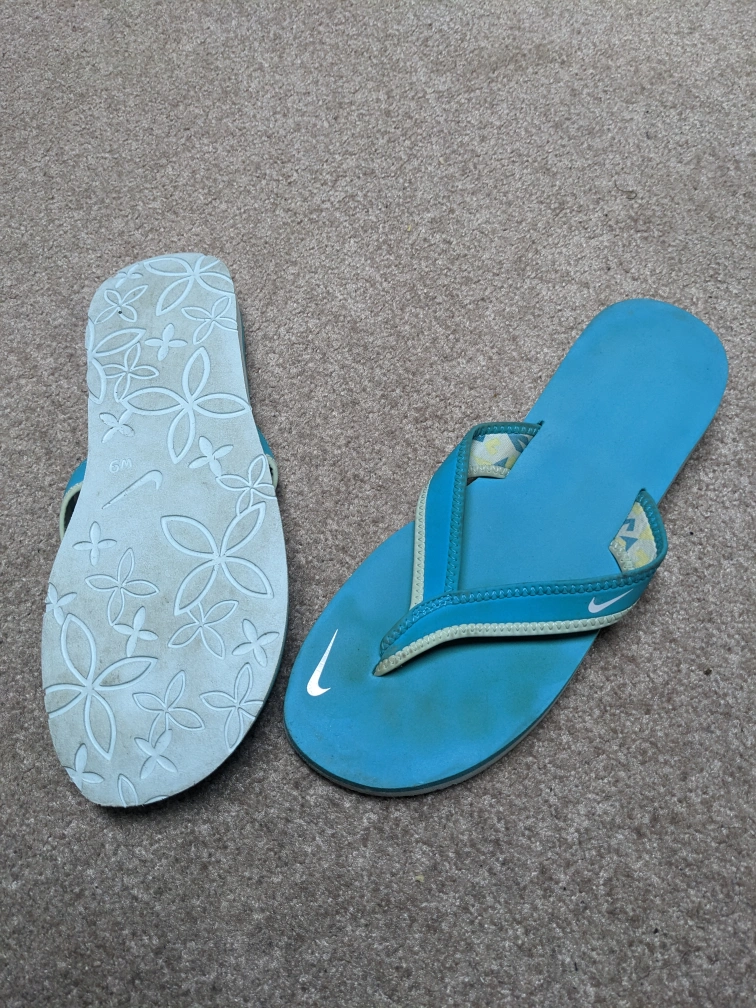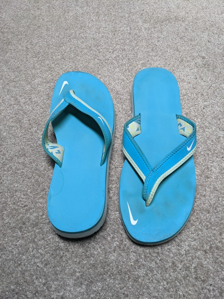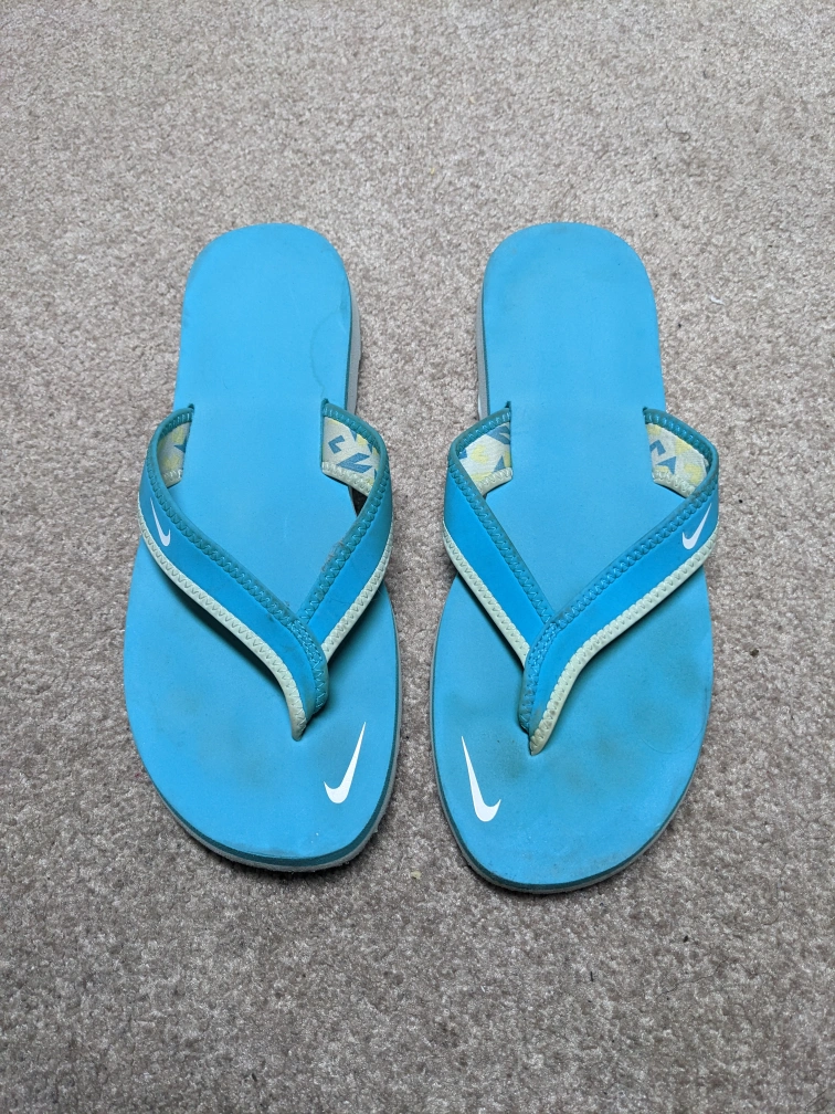 Nike blue flip flops in a women's size 9. The flip flops have a white swoosh on the side and a white flower pattern on the bottom. The top strap is a light blue with white lettering.