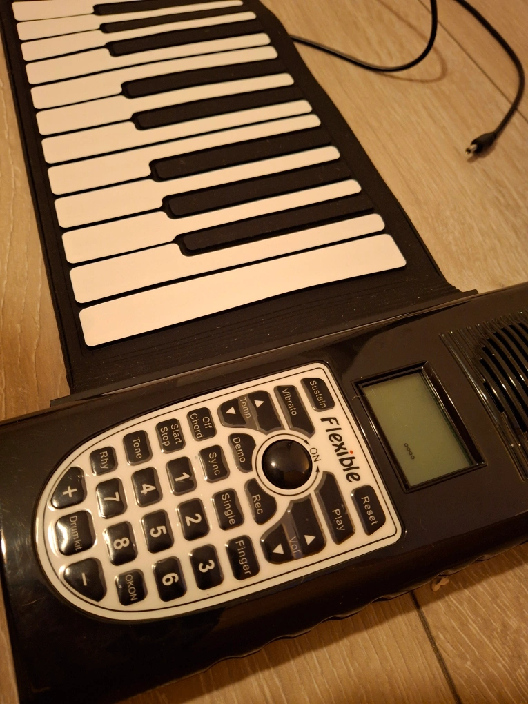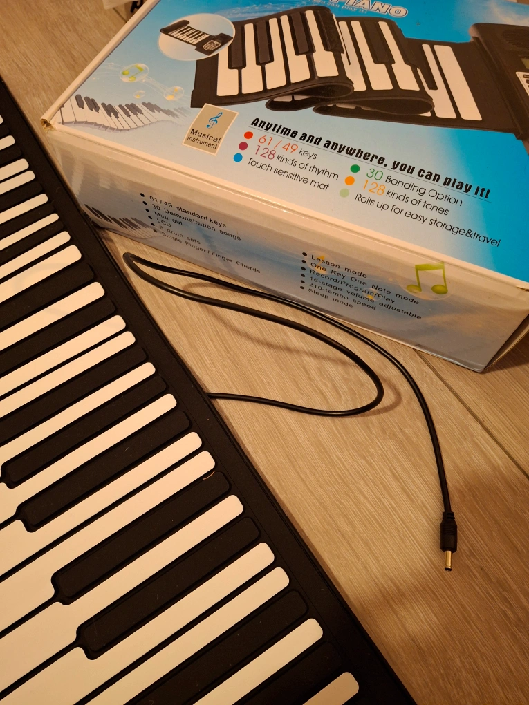 This is a 61 key roll-up keyboard with a variety of built-in features such as recording, demo songs, and different rhythms and tones. The keyboard is USB rechargeable. Includes a USB charging cable and comes in its original box.