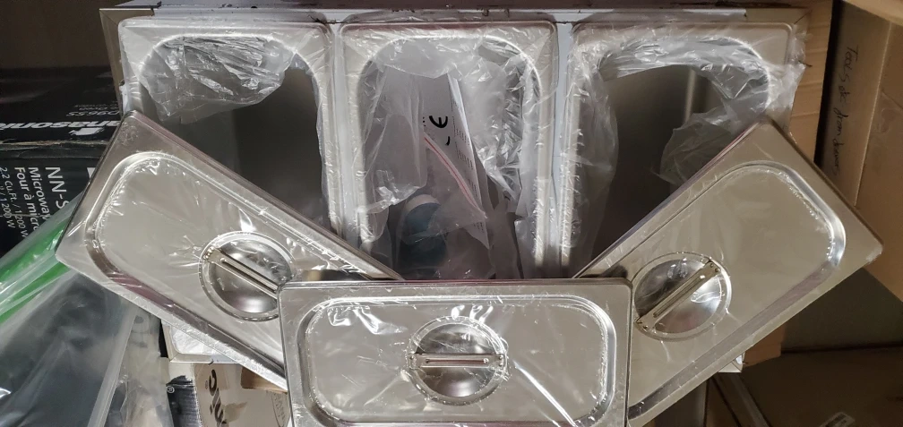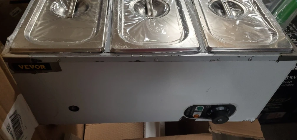 444Brand new in the box with a small dent in the base. Doesn't affect use purely cosmetic. FINAL PRICE Retails for $200 +taxes Three-compartment food warmer with a drain valve and temperature control. Perfect for keeping food warm and ready to serve. Great for buffets, catering, and restaurants.16 Qt Large Capacity: Each Pan Dimensions: 11.8" L x 5.9" W x 5.9" H; Overall Dimensions: 22.6" L x 15" W x 10.6" H. Our commercial food warmer is equipped with three 1/3 pans (5.3 Qt/5L each), allowing you to serve three different dishes simultaneously. The total 16 Qt/15L large capacity meets all your food heating requirements. Precise Temp Control: The food warmer buffet features an adjustable temperature within 86-185℉/30-85℃, operated by a knob for precise control. Thanks to its specially designed internal heating elements, this warmer holds your prepared foods at ready-to-eat temperatures for hours. The U-shaped design also achieves even heat distribution. Food-Grade Stainless Steel: The food-grade 304 stainless steel structure brings this bain marie with rust and corrosion resistance. The thickened wall ensures sturdiness and durability, precluding worry about deformation or scratch. In addition, the detachable pans make cleaning and maintenance a breeze. Considerate Details: Accompanying each pan is a cover designed to keep the pan's contents warm and seal in all the flavors. The practical lid keeps dust from entering and helps retain water so the food does not dry out. Besides, our soup warmer commercial is outfitted with a drainage faucet for convenient water release. Wide Application: You can keep your steamy vegetables, chicken wings, fluffy eggs, or sizzling bacon hot and ready to plate with this steam table commercial. It is a perfect, space-efficient addition to your buffet, concession stand, homestyle restaurant, cafeteria, or hotel breakfast bar, standing up to the daily demands.