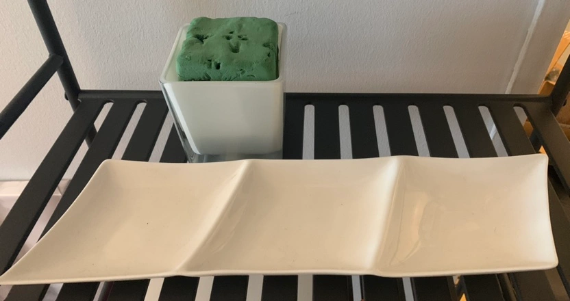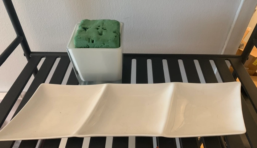 Wall poster + Decor tray for center table + Flower arrangement square vase + oasis block.