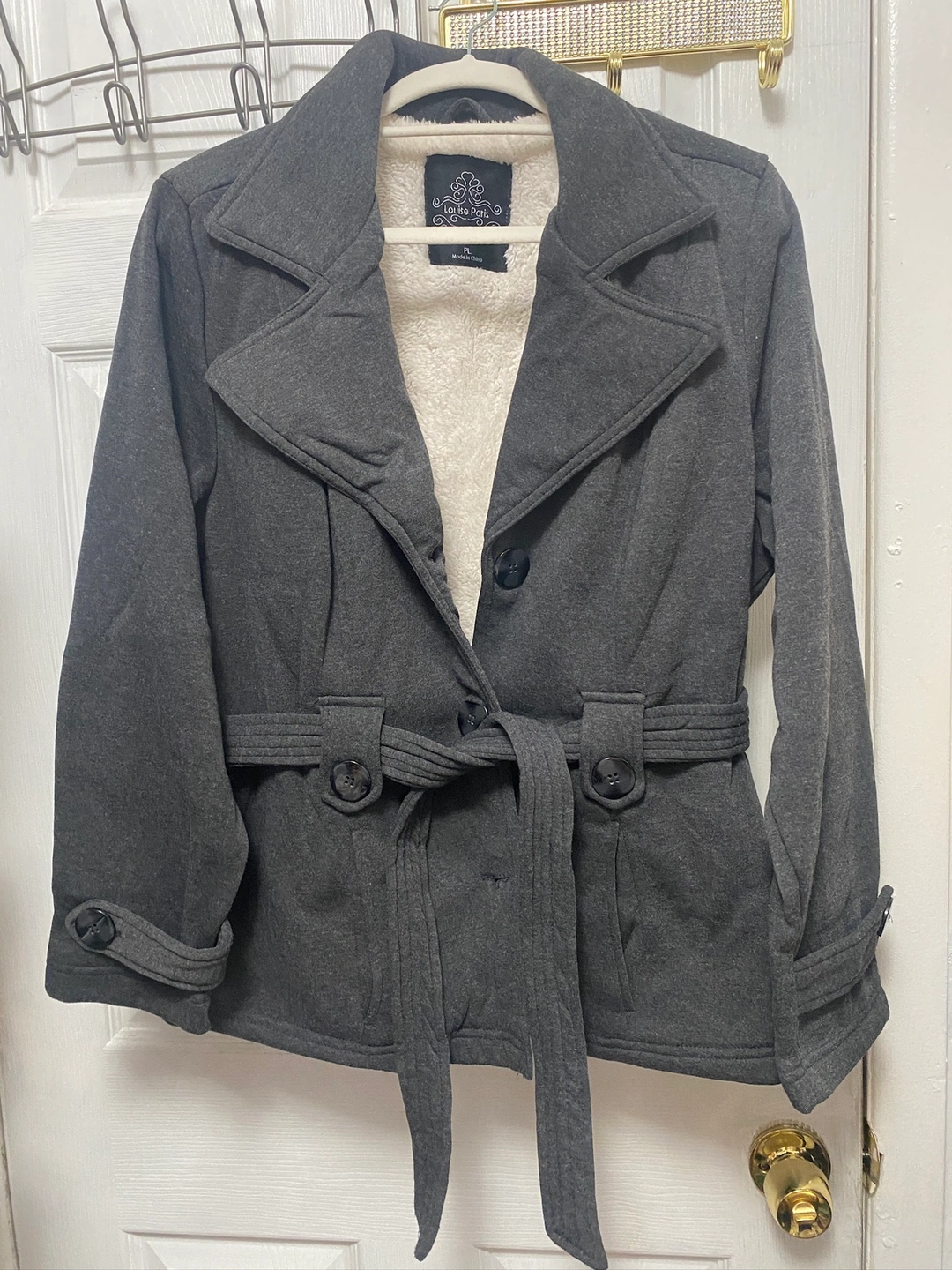 Gray fleece jacket with a faux fur lining, belt, and buttons. The jacket is in size PL. Worn only twice.