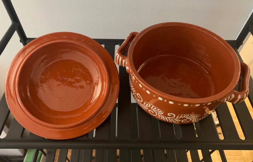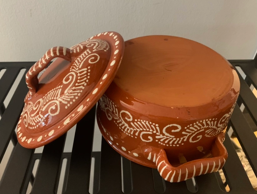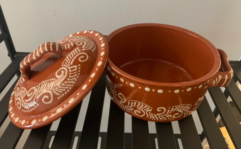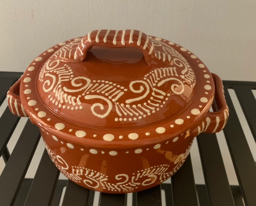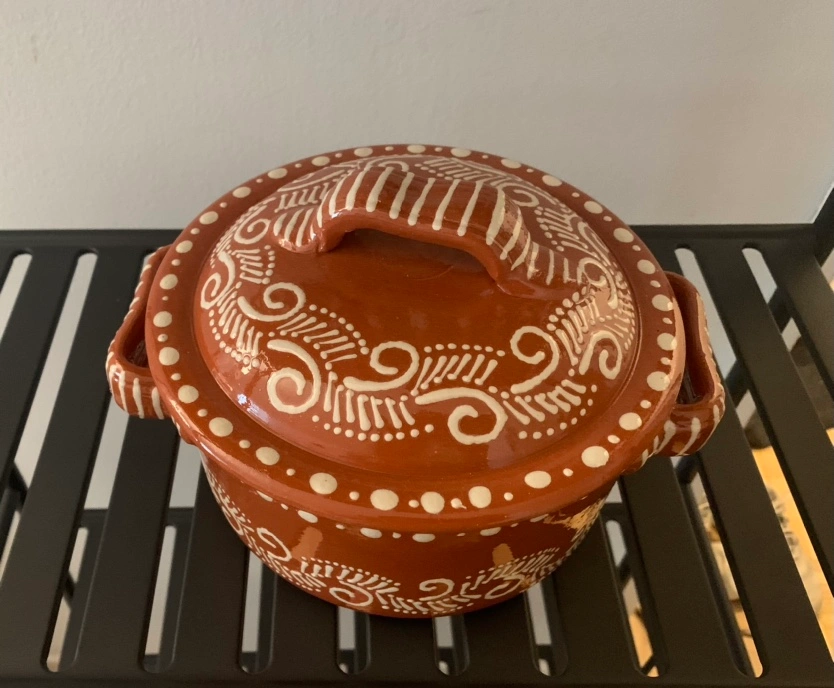 New -Never used - Small ceramic/clay pot with lid and decorative white design.