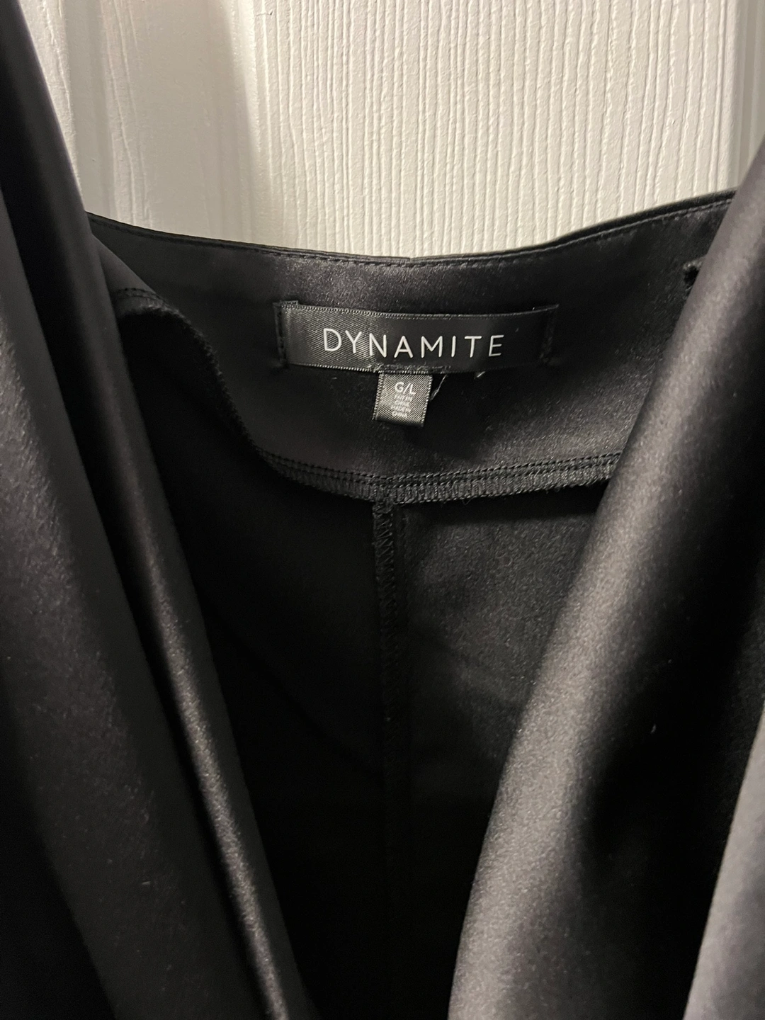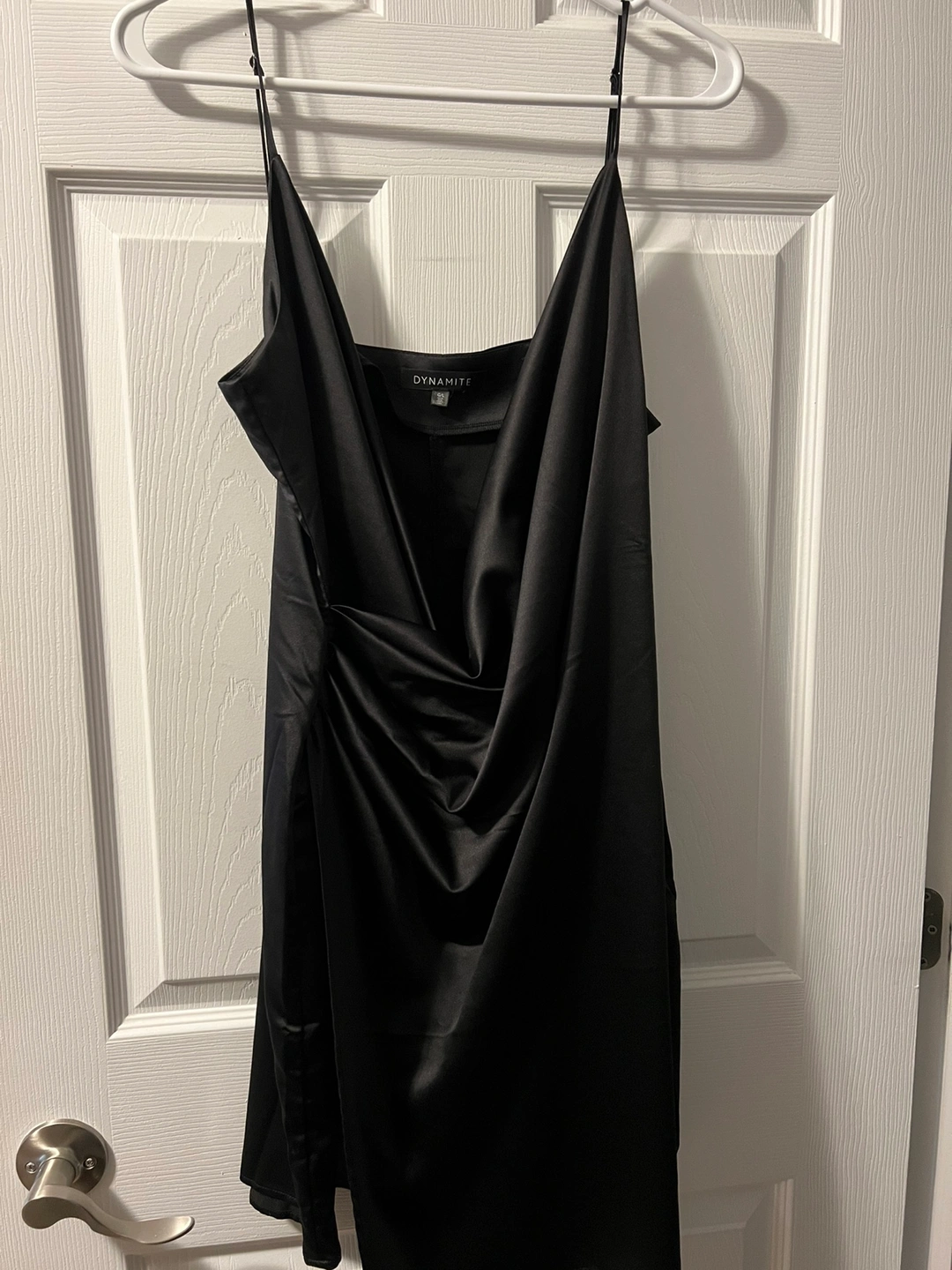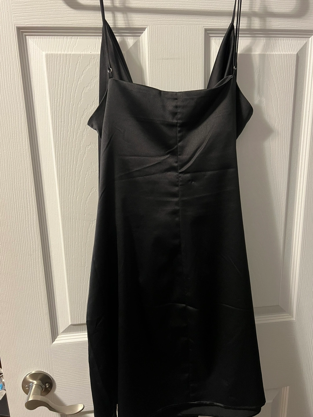 Size Small, black satin slip dress with a v-neck and spaghetti straps.