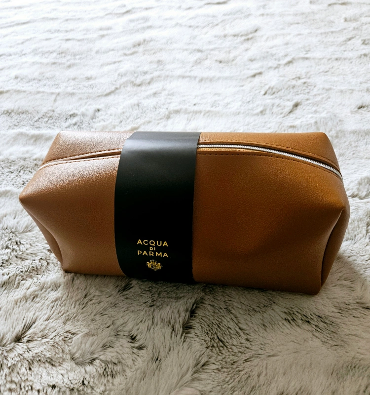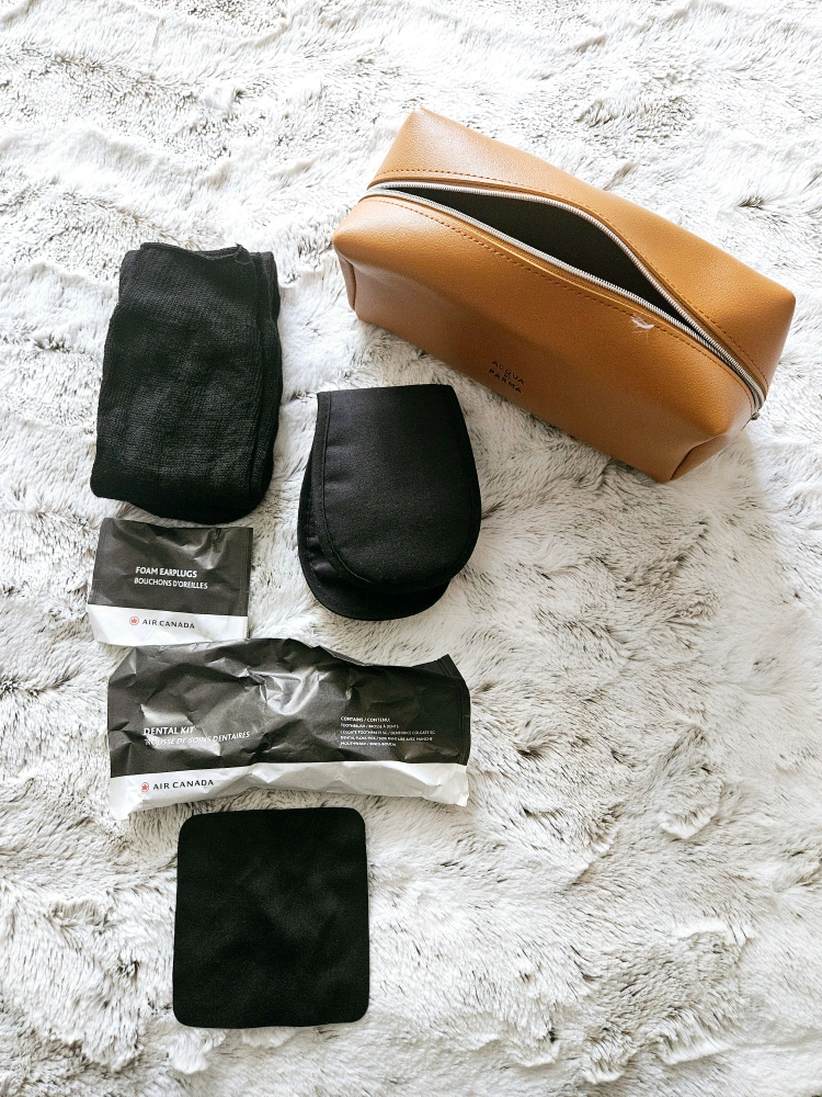 The travel kit includes a leather zippered pouch, a pair of socks, a pair of eye masks, a pair of earplugs, and a travel dental kit.