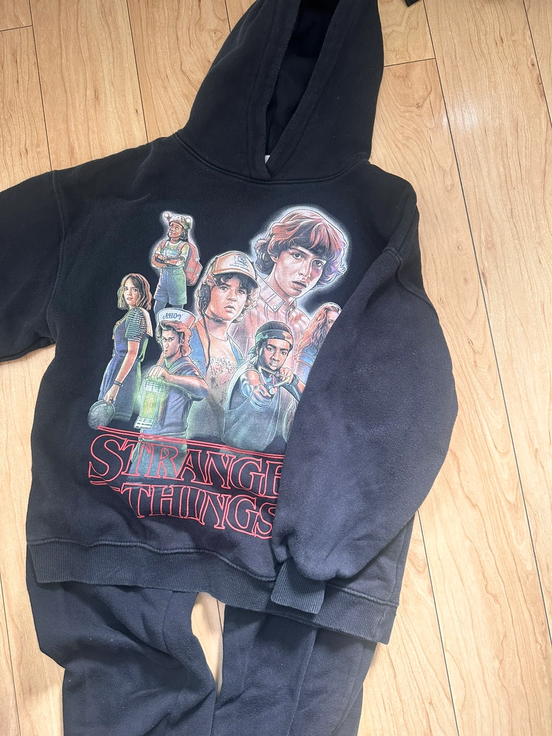 Black hoodie and sweatpants set with a Stranger Things graphic on the front.