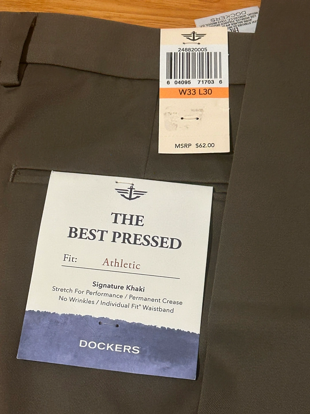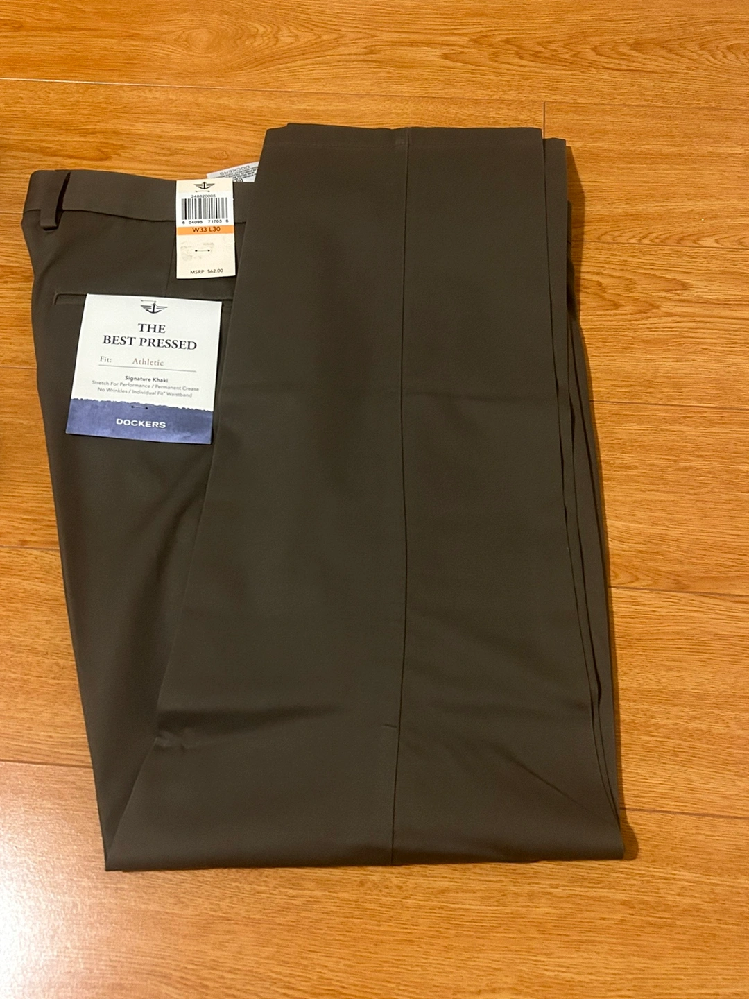 Men's Dockers Signature Khaki pants, size W33 L30. These pants are dark green and have a slim fit.