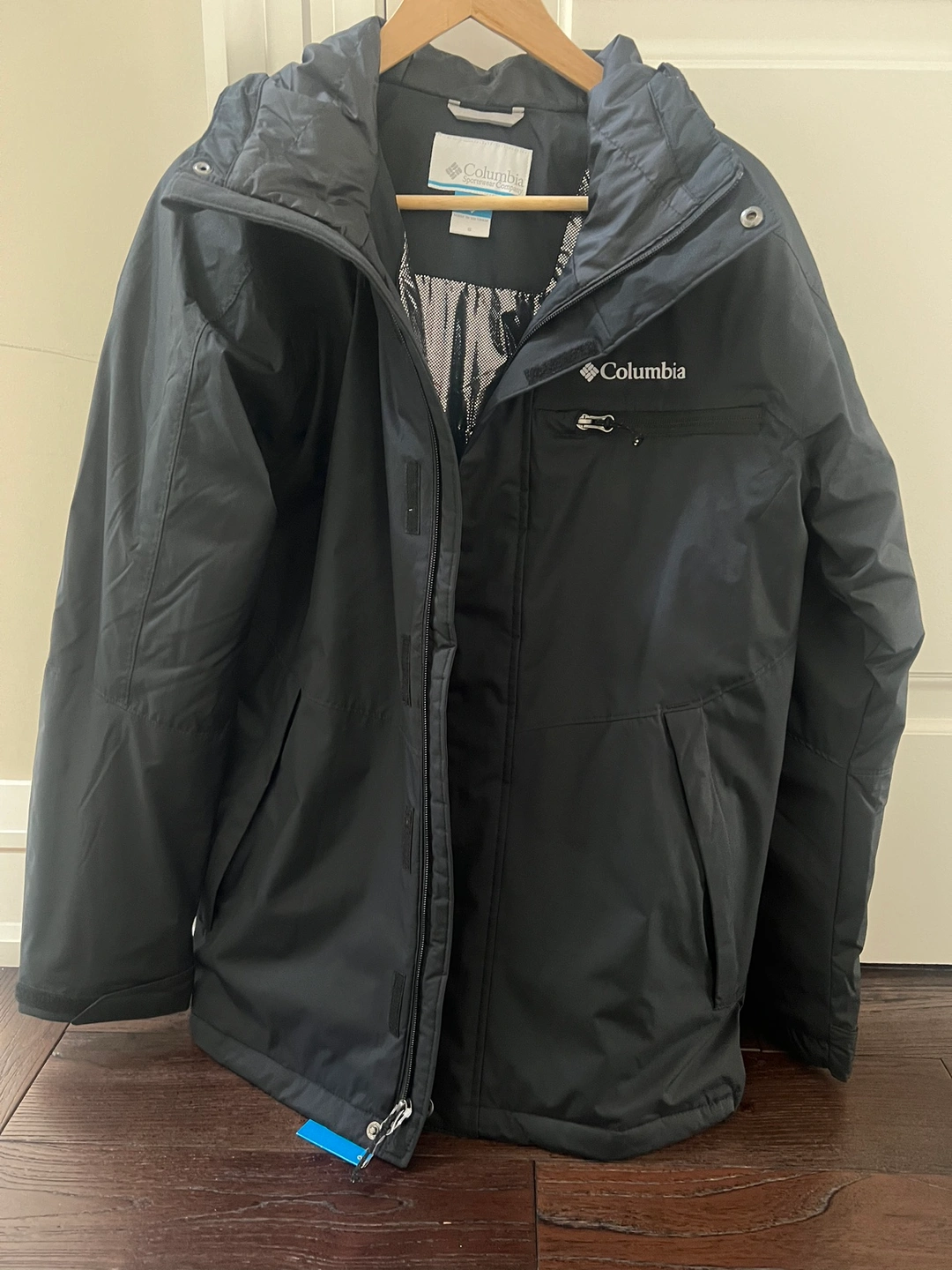 Men's Columbia black jacket size small with a detachable hood. It features a zipper closure with a snap placket. It has two zippered pockets on the front, and a zippered pocket on the left sleeve.